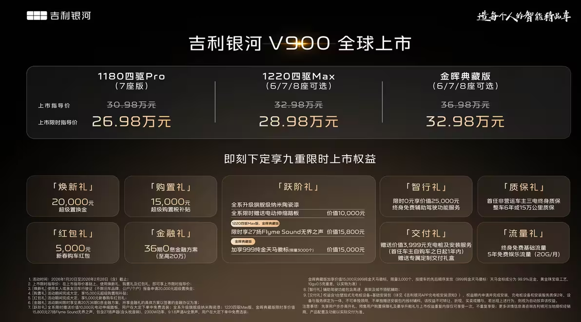 吉利银河v900全球上市 Q: 吉利银河V900的售价和定位如何?A: 共推三个配置,限时指导价26.98-32.98万元,定位“AI全场景家庭旗舰MPV”,主打家用市场。Q: 空间设计有哪些突破?A: 实现91.8%得房率,二/三排纵向空间均超1000mm,后备箱容积1100L,形成“洄游式”自由穿行空间。Q: 三排舒适性如何保障?A: 第三排罕见配备通风加热+电动调节,全舱Nappa真皮座椅,实现“三排同权”的平等舒适体验。Q: 设计语言有何特色?A: 采用“国际审美+东方表达”,前脸格栅融合西湖水纹与泰晤士河波光,大灯内含拱桥映月细节。Q: 性能配置达到什么水平?A: 双电机四驱综合功率340kW,百公里加速6.5秒,搭载路特斯调校AI数字底盘与空气悬架。Q: 安全性能有哪些亮点?A: 高强度钢占比76.6%,通过“魔鬼三连碰”超国标测试,全车11气囊覆盖至第三排。Q: 续航和补能表现如何?A: CLTC综合续航1220km,支持18分钟快充,AI增程系统热效率达47.26%,1升油发电3.77度。