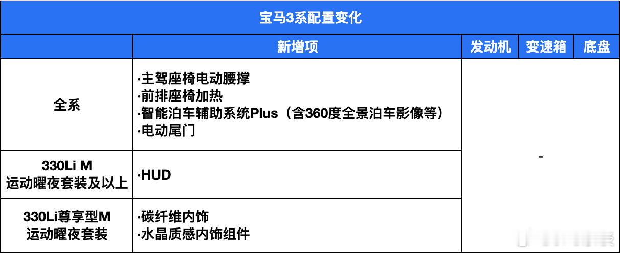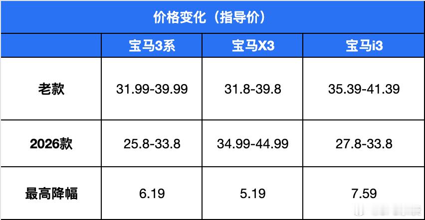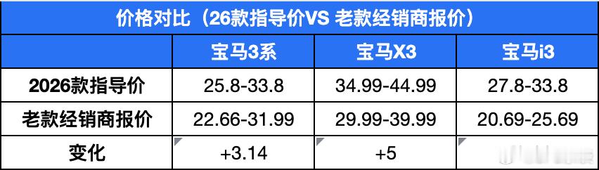 2026款宝马3系/X3/i3集中上市,3系降至25.8万起售BMW 3系宝马X3宝马i3汽场全开 今日,2026款宝马3系、宝马X3、宝马i3正式上市。整体指导价均出现不同规模的下调,其中宝马3系指导价(25.8-33.8万)、宝马X3(34.99-44.99万)、宝马i3(35.39-38.39万)。也就是说,宝马彻底不装了,25万就能买宝马3系,彻底亮给你看。编辑视点:这波新车的指导价都出现了幅度不小的下降,其中3系的指导价更是降至了25万级,作为豪华品牌的宝马,这回彻底不装了。不过对于消费者来说,这三款新车的变化并不明显,这时如果经销商为了清库存优惠力度更大,那选择老款车型会是个更务实的选择。不过,虽然从指导价上来看,2026款对比老款便宜了不少,但老款指导价存在更高的价格水分(经销商根本不接受厂家的指导)。如果从实际的一线价格来看(经销商报价),2026款车型指导价还是贵了不少,其中3系贵3.14万,X3贵5万,i3贵的最多,直接涨了8.11万。当然,光看价格不看配置变化那就是耍流氓。不过在我们把新老款配置进行对比之后,发现新款车型并没有太多变化。宝马3系发动机、变速箱、底盘方面均无升级,配置变化主要集中在一些舒适性配置上。全系新增主驾座椅电动腰撑、前排座椅加热、智能泊车辅助系统Plus(含360度全景泊车影像等)、电动尾门。330Li M运动曜夜套装及以上车型新增HUD;330Li尊享型M运动曜夜套装标配碳纤维内饰,新增水晶质感内饰组件。宝马X3发动机、变速箱、底盘均无变化,外观方面在边框、行李架处有少许变化,整体配置新增项目不多。全系标配曜夜套装(老款入门版本无该套装)、标配M运动型多功能真皮方向盘、标配主驾座椅的腰部支撑、标配5G车载网络。30L系列车型标配HUD,25L依旧为选装。宝马i3在外观、内饰设计以及动力、续航方面与老款车型基本保持一致。全系标配360全景影像、泊车辅助、循迹倒车、前排座椅加热、感应式电动尾门、主驾座椅腰部调节、车载5G网络。车外摄像头2颗→5颗,8颗超声波雷达→12颗。40L系标配HUD(35L仍需选装)。整体来看,新款车型在外观、以及核心配置上基本上都没有变化,升级点普遍为一些不痛不痒的舒适性配置。目前新款车型已经到店,老款车型为停产在售状态。在新款车型变化不大的情况下,如果老款车型的优惠力度更大,你会怎么选择呢?