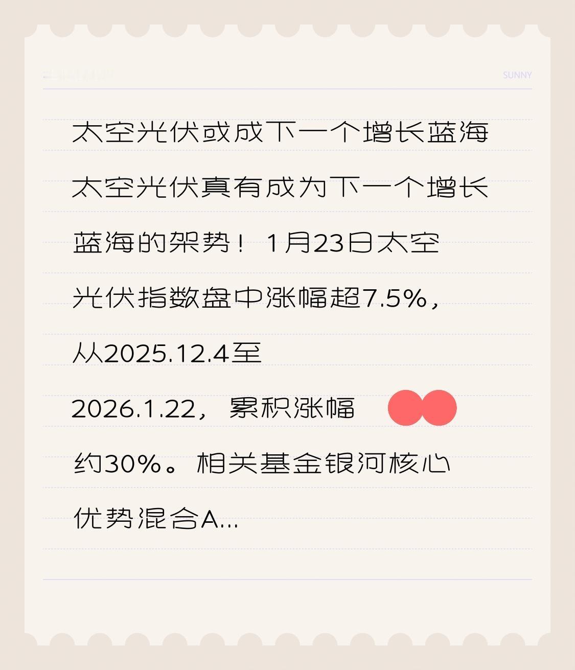 太空光伏或成下一个增长蓝海 太空光伏真有成为下一个增长蓝海的架势!1月23日太空光伏指数盘中涨幅超7.5%,从2025.12.4至2026.1.22,累积涨幅约30%。相关基金银河核心优势混合A近6月累计净值增长74.53%。 市场表现也很亮眼,1月22日光伏ETF(159857)成交额近1.5亿元,居深市同标的首位。特斯拉CEO马斯克也力挺太空光伏,要推进太阳能产能提升。我国提交超20万颗卫星星座申请,会带动太空光伏长期需求。它能在太空轨道等获取能源,为多领域供电,技术也在不断迭代。看来太空光伏的黄金时代要来了!