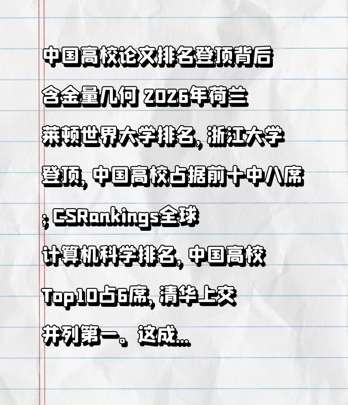 中国高校论文排名登顶背后含金量几何 2026年荷兰莱顿世界大学排名,浙江大学登顶,中国高校占据前十中八席;CSRankings全球计算机科学排名,中国高校Top10占6席,清华上交并列第一。这成绩确实让人振奋,说明咱们高校科研有两把刷子。 论文产出与引用数据是衡量学术成果影响力的重要方面,能在榜单上有这样的表现,证明我国高校科研实力在提升。但论文数量只是评价科研实力的一个维度。回顾世界科学中心转移,每次更迭都是多种创新要素综合作用。美国靠人才“引进—培养—产出”循环,科研优势维系近百年。所以,面对排名,咱得清醒,科技强国靠的是人才储备、创新生态和科学精神。