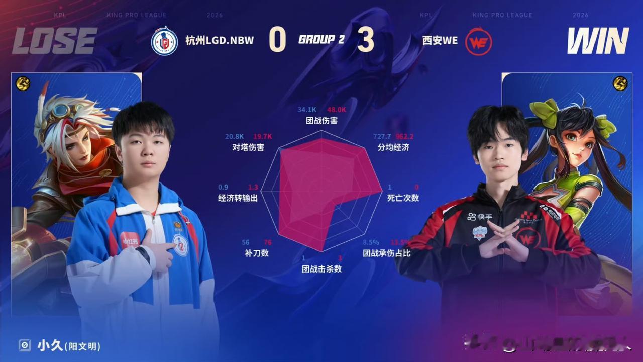 2026年KPL春季赛常规赛第一轮第二周(1月23日),西安WE 3-0 横扫杭州LGD.NBW,豪取赛季两连胜;LGD则遭遇赛季三连败。 WE 3-0 LGD.NBW(BO5) 昭珏射手状态拉满,达成连续6小局零死亡,第三局孙尚香逆风救世;明崽不知火舞、西施节奏亮眼 第三局WE在LGD领先5k经济、破两路高地的绝境下,靠忆安太乙真人闪炸后排+昭珏孙尚香残血拉扯完成翻盘,终结比赛 WE摆脱过往18连败阴影,两连胜显新阵容实力;LGD磨合不顺,大概率落入B组 第一局:WE子意哪吒针对LGD艾琳,6分钟打出零换四控节奏,16分钟破水晶 第二局:WE明崽不知火舞对位压制,3分钟集火击杀沈梦溪,稳拿赛点 第三局:LGD前期零换三占优,WE韧性拉满,昭珏孙尚香守高收割,一波终结