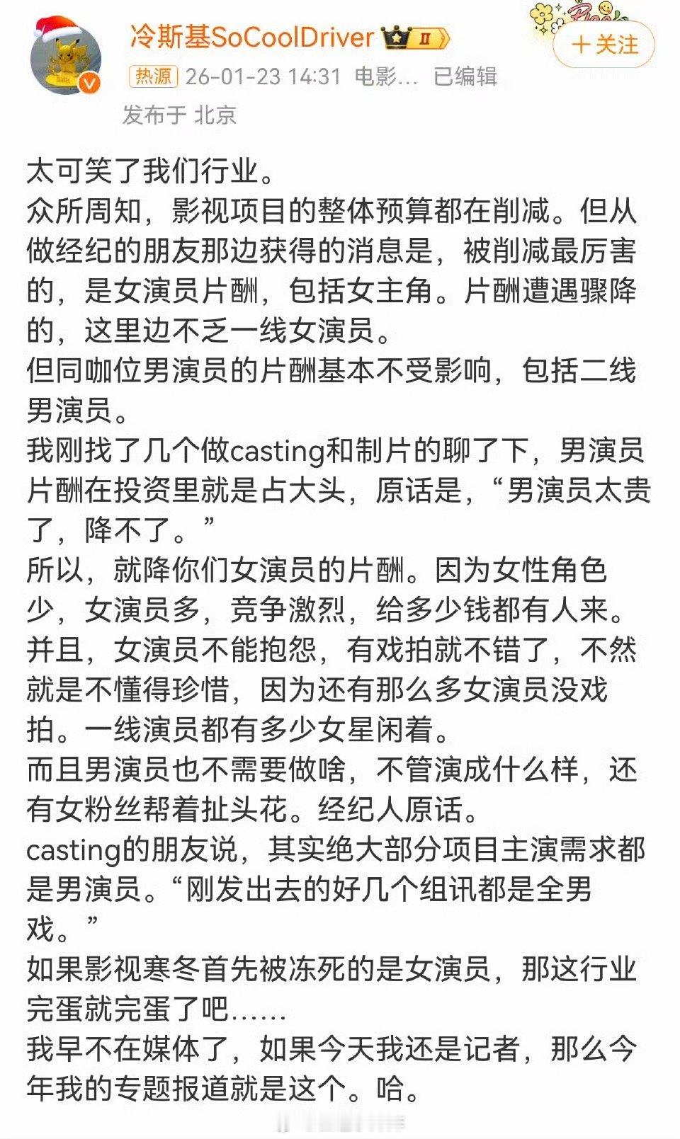 影视项目 全男戏建议女演员亲自开麦说话不要在那扯虎皮拉大旗,我等普女不当枪影视寒冬会不会冻死女演员咱不知道但我们都知道,即使降薪再降薪,女演员拿到手的片酬也能抵普通人努力工作n年当然,男演员拿的更多…真诚建议整个内娱再砍一刀🔪一刀拉齐水位线