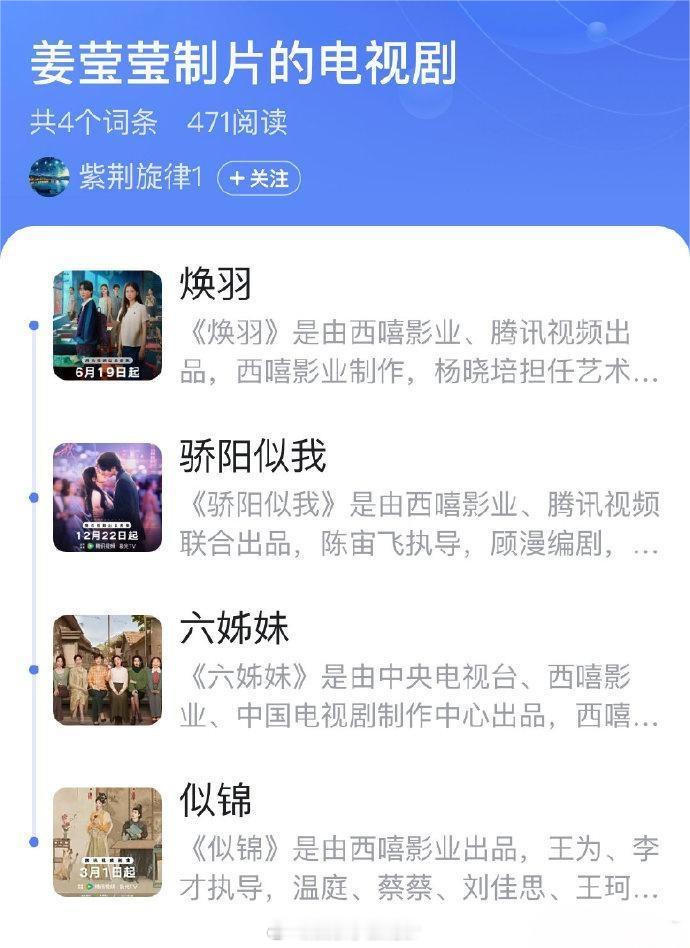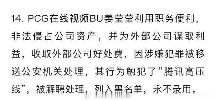 制片人姜莹莹被移送公安机关 腾讯发布反舞弊通报:制片人姜莹莹利用职务便利,非法侵占公司资产,并为外部公司谋取利益,收取外部公司好处费,因涉嫌犯罪被移送公安机关处理,其行为触犯了“腾讯高压”,被解聘处理,列入黑名单,永不录用。百度百科显示,姜莹莹参与制片的电视剧有《焕羽》《骄阳似我》《六姊妹》《似锦》。