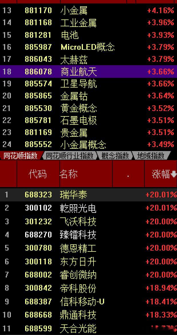 这一周大A控盘稳定,在5日10日线震荡,在于领导层的精准控盘,每次将要突破的时候,又把打下来,就像今天盘中五次上行到4140附近均被压制下来,最后一次一度翻绿,但尾盘还是拉红4136点,说明资金承接力强,重心在上升,一根放量十字星四大指数均红色报收,北证50涨逾3%但上证50etf等9连阴走势,其分时图和大A类似,银行保险煤炭等大金融领跌居前,说明郭嘉队控盘意图明显,让大A走慢牛,而不是快牛疯牛场外资金积极进场,量能再破3万亿,比昨天放量4000亿左右,说明市场也带来了挣钱效应,翻红3900多家,绿1300多家,涨停121家,百股涨停局面,跌停2家今天热点快速轮动,商业航天概念火爆,连续大跌后存在超跌技术反弹需求,去伪存真,不能像上次搭上概念就炒的,需要看有真正技术产品的公司,乾照光电,臻雷,东方日升,超捷,信维通信,航宇微等领涨,而全球航天巨头SPACEX,也在加速布局,蓝箭航天也在IPO路上前面商业航天+卫星导航概念,今天是商业航天+太空光伏概念,作为卫星唯一高效长期稳定能源形式的太空光伏也是作为重点领域,航天器和卫星上搭载光伏组件,为其提供电力支持正常运转,如果太空部署大型光伏阵列,通过微波或激光形式将捕获的太阳能传输至地面接收,然后转化为电能,接入电网提供给人类使用,这是最终解决能源问题,还有很长一段路要走,是资本泡沫还是能源未来呢?所以当商业航天的刚性需求,和AI算力的发展,让太空光伏进入视眼,太空光伏商业化,主要集中在发射,建设,运输等环节,马斯克再次提到太空光伏等,让光伏设备,BC电池,HJT电池,光伏概念等概念板块,成为今天大A领涨主流,东方日升,奥特维,天合光能,捷佳伟创,明阳智能拓日新能等大批量超40家股涨逾9%以上,下周关注持续性涨价能源金属,锂矿也受益,想到什么股呢黄金板块妥妥新高,4950美元每盎司,5000尽在眼前呢,受到美联储降息预期,地缘地区不稳定性因素,金价大概率还会涨,2026年或涨幅30%左右,5500美元每盎司呢这也让年轻人结婚买不起了三金首饰等,哎前面说过商业航天和半导体存储芯片在抢资金,今天一目了然,CPO光模块产业链,AI50等休整,但不会缺席,科技主题逻辑下,大方向不变,做好自己风格的选择,调整下来是低吸埋伏时机