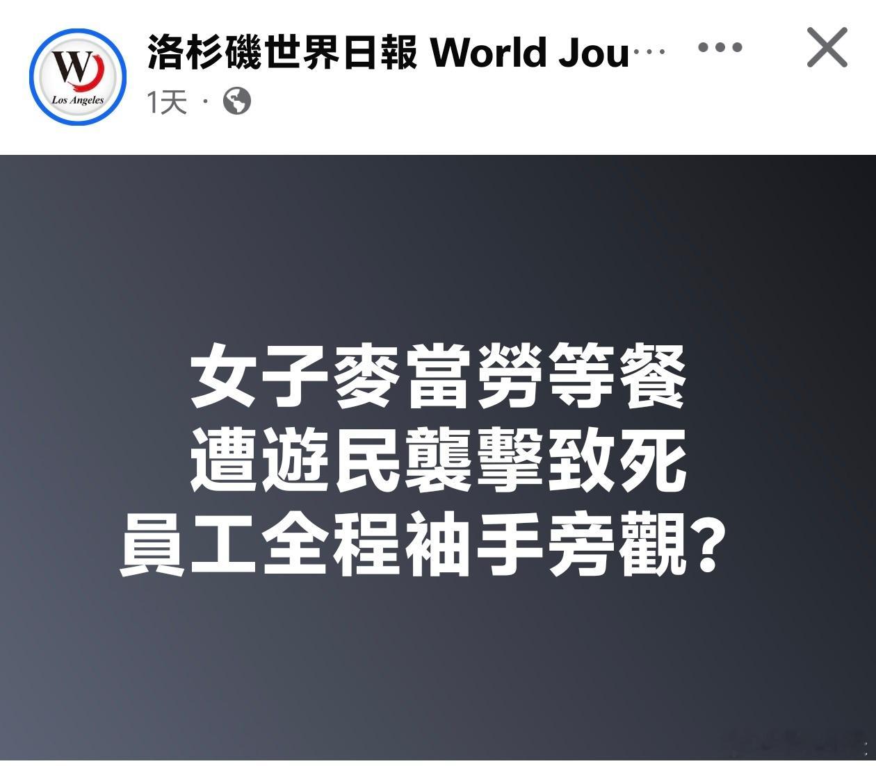 洛杉矶女子麦当劳等餐遭流浪汉袭击身亡2024年3月9日晚,夫妇Jose Juan Rangel与Maria Vargas Luna在洛杉矶一家麦当劳车道排队取餐时,流浪汉Charles Cornelius Green Jr.突然发狂,先猛扑向丈夫Rangel反复击打其面部,随后试图袭击坐在副驾的Luna。Rangel下车护妻,与Green扭打被推倒。Luna下车相助,却被Green猛力推倒,头部重重撞击地面,导致严重脑损伤。救援人员赶到时,Luna已心脏骤停。她被送医抢救,靠生命维持系统撑了数月,最终不幸离世。受害者丈夫已向法院提起过失致死诉讼,指控麦当劳明知这名“众所周知”的游民长期在店外徘徊、向顾客讨钱,当晚在Drive-thru附近逗留超10分钟,员工通过监控和窗口清楚看到其异常举动,却未报警、未提醒顾客、未采取任何防范措施。袭击发生时,店员依旧袖手旁观,既未拨打911,也未提供任何帮助。牢A高强度回复网友提问老鼠干火到美国了
