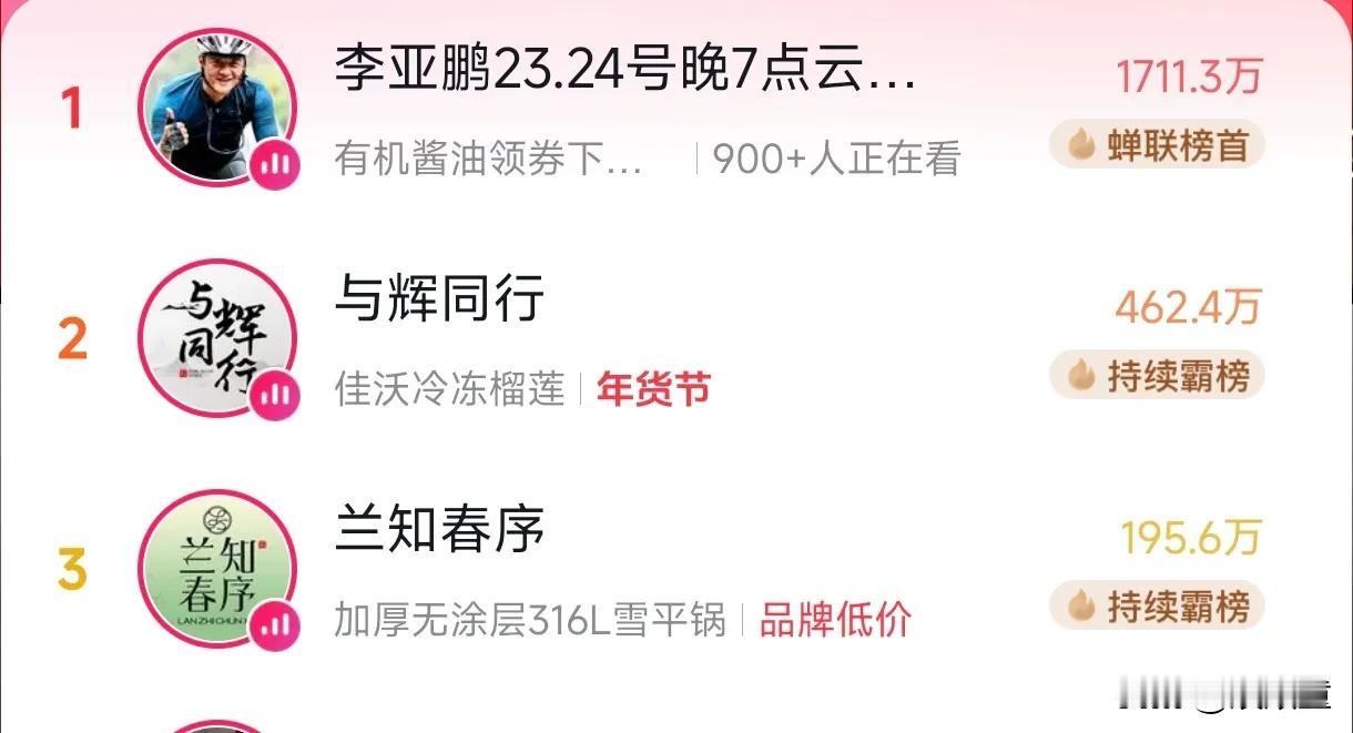 用数据说话,李亚鹏也算是苦尽甘来! 今天李亚鹏直播,销售额是“遥遥领先”,与排在第二名的与辉同行,差距很大,这是这两年没有出现过的情况! 大家对李亚鹏的支持,也是对善意的支持,李亚鹏也没想到,自己“苦尽甘来”的一天,会是在这样的绝境中出现的! 同样也说明了,国人大爱的心从未改变过!