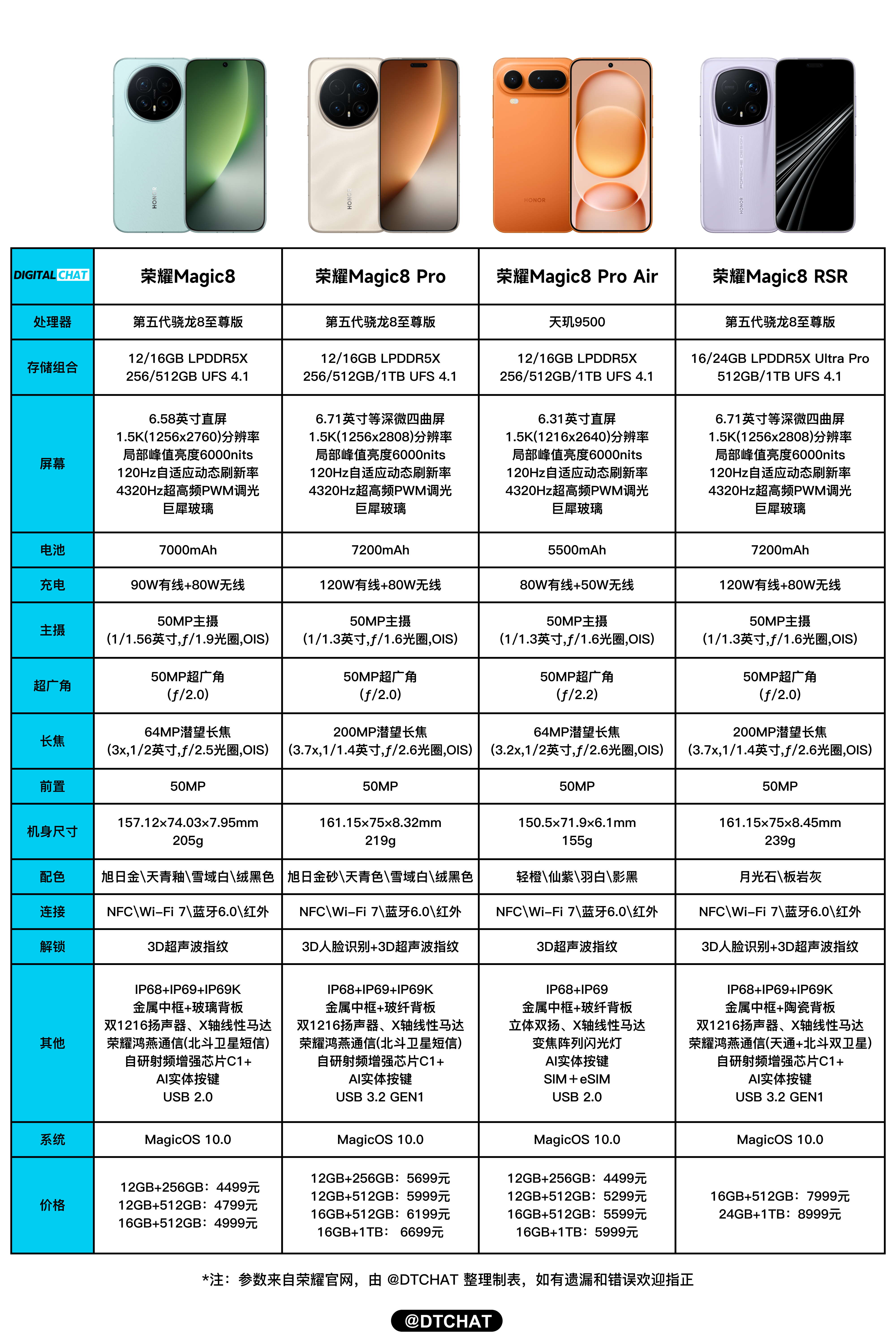 一图看懂荣耀Magic8系列四款机器的参数配置,荣耀Magic8、荣耀Magic8 Pro、荣耀Magic8 RSR三款都是荣耀之前的产品线,保时捷设计在Pro的基础上做了外观升级材质选了陶瓷后盖,拥有更大的内存配置,支持双卫星,其他配置和Pro保持一致。荣耀Magic8 Pro Air是新增的产品线,主打轻薄,这机器只有6.1mm厚,155g重,但电池做到了5500mAh,比苹果的Air大不少,轻薄机身里面也有1/1.3英寸大底主摄(Pro同规格)、64MP潜望长焦(标准版同规格),价格和标准版保持一样,多了一个1TB版本,四个版本大家怎么选?