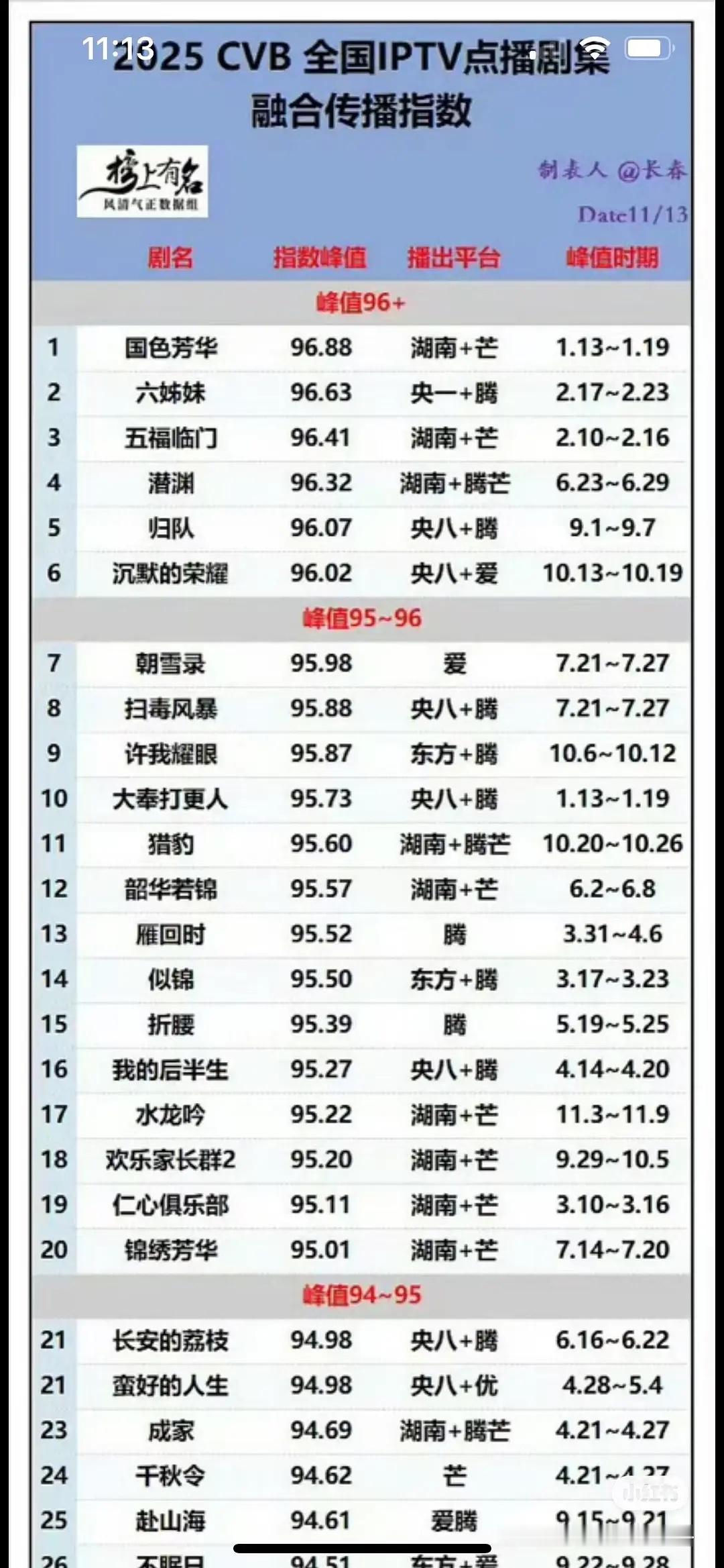 玉茗茶骨IPTV峰值破96.37!持续霸榜CVB点播数据!玉茗茶骨在播期间一直为IPTV点播用户榜首,峰值已达96+,去年全年96+的剧只有6️⃣部!