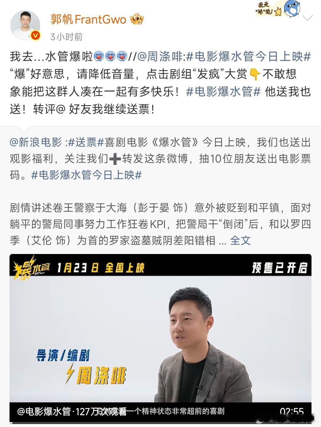 还以为郭帆公司水管爆了 把郭帆打call《爆水管》看成公司爆水管,导演拍过球2,喜剧人超多,又好笑又有燃戏超解压