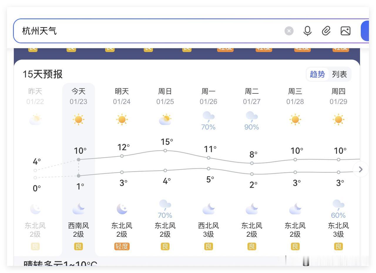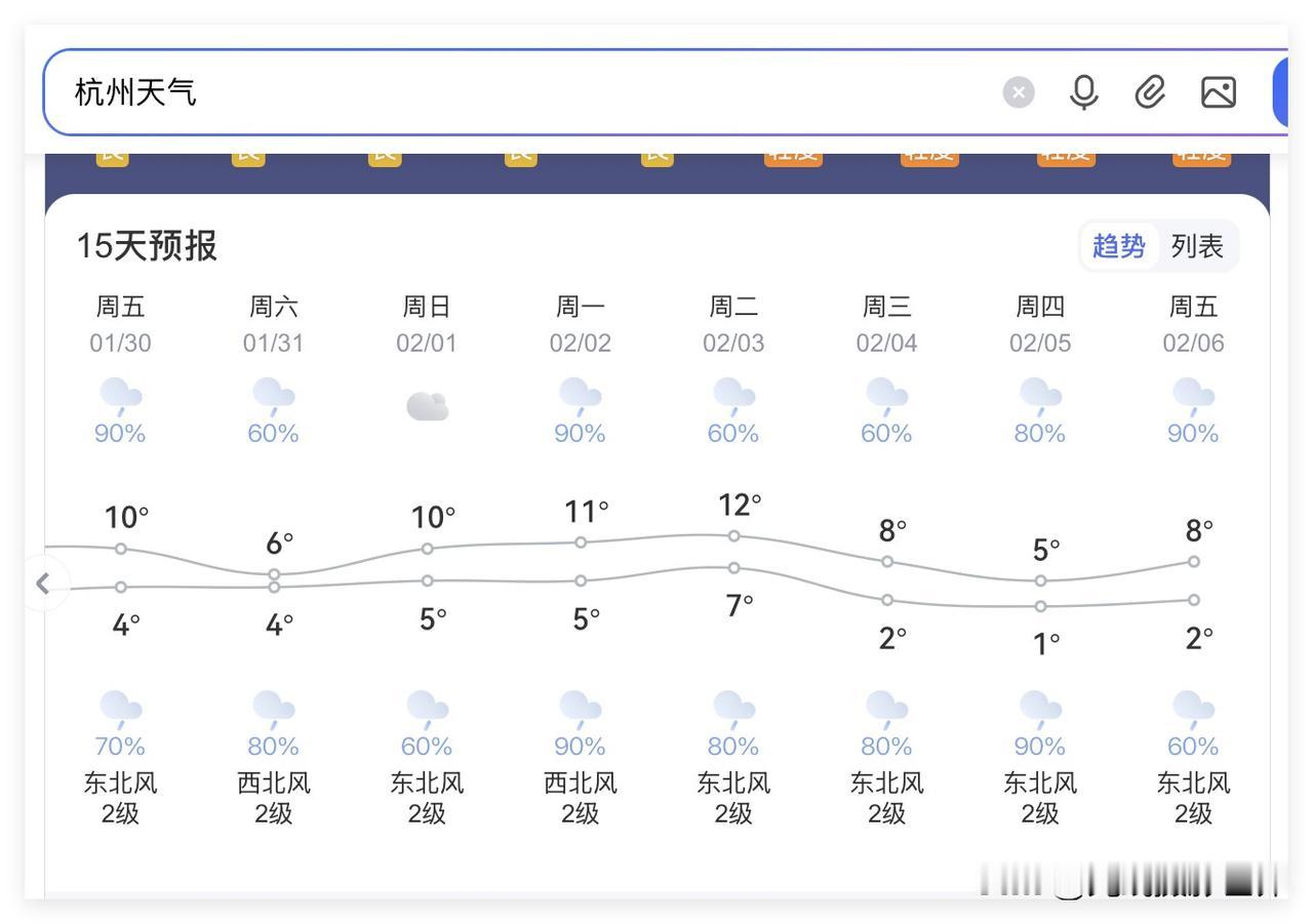 哎呀!好惨!浙江省杭州市,1月30日到2月6日,几乎每天都要下雨,凄风冷雨,阴冷潮湿……所以,大家好好珍惜1月24日到29日的太阳公公……虽然1月26日和27日的杭州可能会下雨…… 哎呀!寒假即将正式开始……大学生即将迎来返程或者寒假旅游高峰……春运即将…… 好吧,杭州接下来的天气预报……确实让人不太舒服啊! 只是,即便如此,好像杭州市真正下雪的可能性,非常渺茫啊! 哎,多么希望这一轮阴雨天气和凄风冷雨的大降温,能够给杭州市带来真正的大雪纷飞啊! 不然的话,就是白白受冻,白白受苦啊!