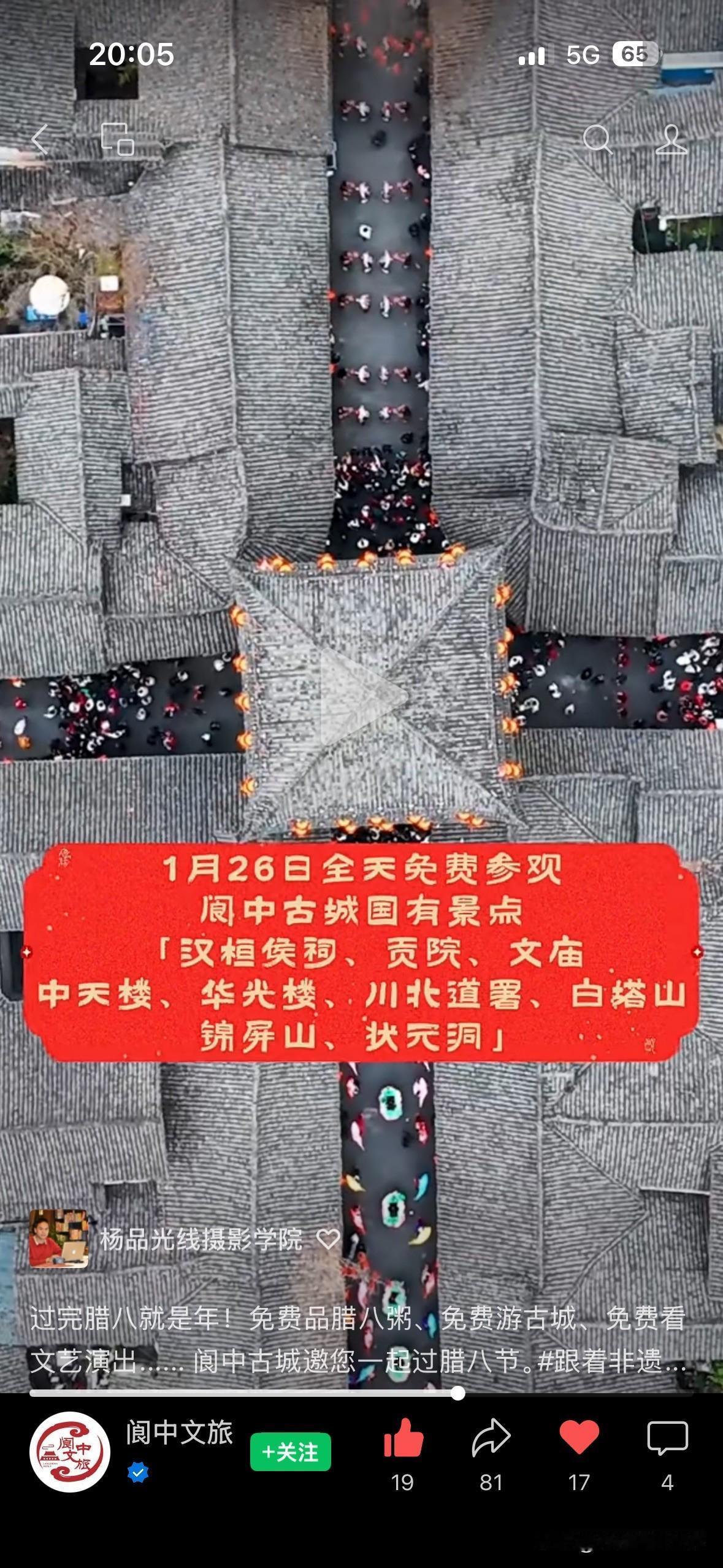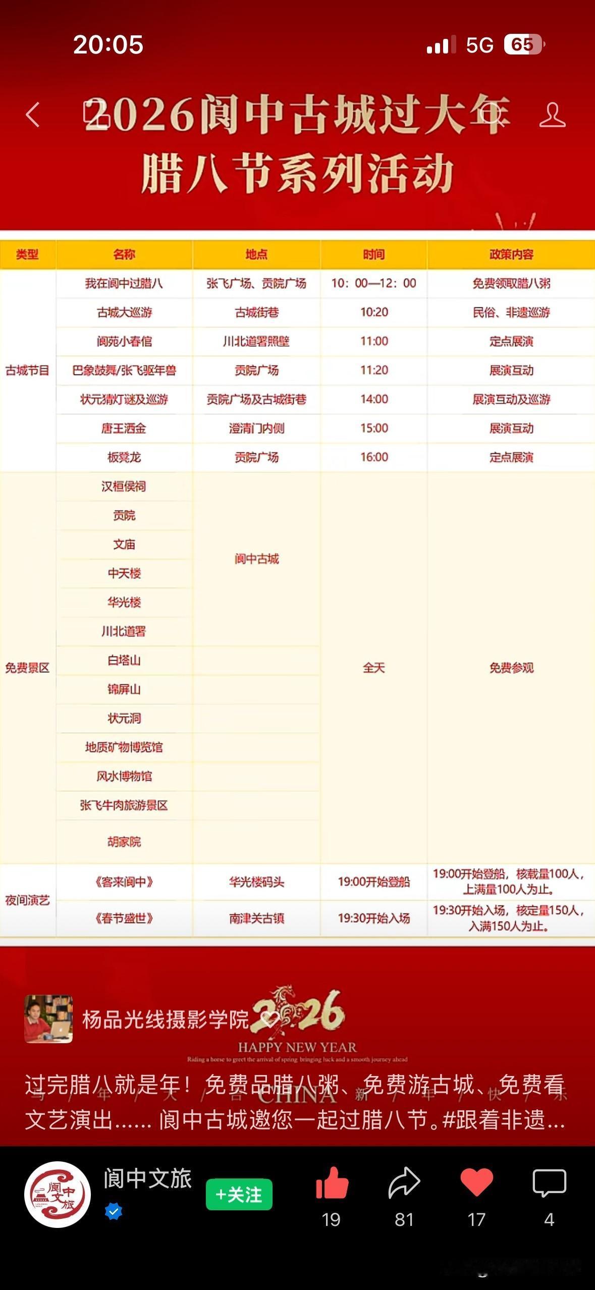 超级坏消息来袭!1月26日,腊八节的阆中古城,所有国有景区景点免费开放!尤其是中天楼,居然要免费开放!所以,请问,我究竟能不能挤上去啊?!真心希望,中天楼,不要免费,千万不要免费……中天楼,最好还是收门票,限制客流量啊! 我感觉,我很悲伤,我很伤心,如果1月26日中午,我不能再阆中古城的中天楼有一个拍摄机位的话,我就……想死的心都有了啊! 1月26日,上午10点到12点,张飞广场+贡院广场,免费领取腊八粥。 1月26日,上午10点20分,古城街巷,民俗、非遗民俗,古城大巡游开始。 1月26日,上午11点,川北道署照壁,阆苑小春倌,定点展演。 1月26日,上午11点20分,贡院广场,张飞驱年兽+巴象鼓舞,展演互动。 1月26日,下午2点,贡院广场及古城街巷,大巡游。 1月26日,下午3点,澄清门内侧,唐王洒金,展演互动。 1月26日,下午4点,贡院广场,板凳龙,展演。 1月26日晚上7点到7点半,华光楼码头和南津关古镇,晚上还有夜间演艺……这个可能会有点寒冷……啊啊啊! 嗯嗯,1月26日,阆中古城,门票不便宜的张飞庙、文庙、贡院、中天楼、华光楼……全部免费! 当然,如果单独只去中天楼或者华光楼,门票还是非常便宜的啦! 好吧……真心希望,怎么讲呢?!确实,最好还是建议中天楼不要免费开放啊! 2026年春节的阆中古城旅游旺季,从这周末开始,1月23日,重庆九龙坡区的小学生好像已经期末考试,从1月24日开始等于放假啦!这周末,大多数大学生都开启寒假…… 过了腊八就是年啊! 阆中古城的春节旅游旺季,就是从这周末正式开始啦! 再接下来,就是阆中古城的小年……可是,火车票就不好搞了啊!呜呜呜! 春节,除夕,正月初一……元宵节……阆中古城,真的是特别好玩好逛好吃啊! 摄影畅销书作家曾兰老师,光线摄影学院曾兰老师,北京大学出版社签约作者曾兰老师……这次受出版社和大厂的委托,拍摄阆中古城的2026年腊八节民俗活动……真心希望,一切顺利!不要太多太多人啊!不要挤不进去啊!啊啊啊啊! 2026年春节,川渝的春节,可能是全国人气最旺的!重庆+宜宾+自贡+阆中古城,可能是2026年春节全国最有年味也最火爆的地方啊! 光线摄影世界曾兰谈天说地