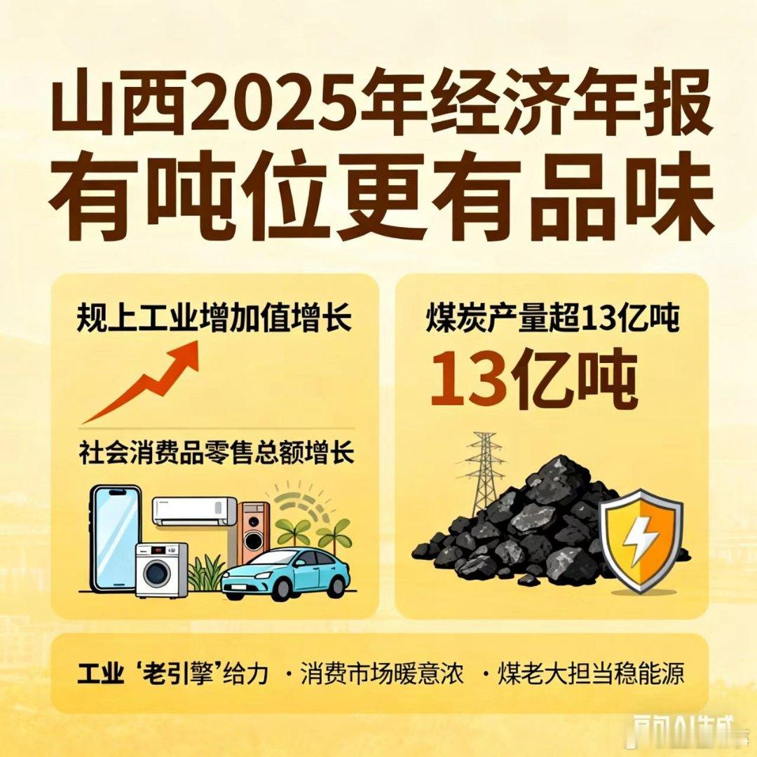 山西2025经济数据发布咱身边的变化比数据还亮眼山西这“年报”,有吨位更有品味!朋友们,刷到山西2025年的经济“成绩单”了没?过去一年,顶住压力干得是风风火火。工业这台“老引擎”依旧给力,规上工业增加值蹭蹭地涨;消费市场也暖意融融,大家伙儿买手机、换家电、开新能源车的热情那叫一个高,社会消费品零售总额稳稳向上。最让人安心的是,咱“煤老大”的担当一点没含糊,全年产量稳稳超过13亿吨,保障国家能源安全的基石那是杠杠的。这份“家底”,厚实!“智”变升级,老饭碗盛上了新饭 不过啊,山西可不止会“挖煤”。看看现在的转型架势,那真是“新”潮澎湃!数字经济搞得多火热,省里都出了全面发展方案,要在气象、交通这些领域把数据用活。以前挖煤炼钢,现在玩的是“数据”这座新富矿。厂矿车间里也越来越“聪明”,智能制造遍地开花,连钢铁厂都搞起了“钢-焦-化-氢”一体化的绿色循环,冒烟儿的少了,科技感足了。高端装备、电子信息这些新产业正在加速跑,让经济“体格”更强健。老工业基地,正长出“新质生产力”的肌肉!小镇有大能量,老百姓日子有奔头 再说说身边的惊喜。你可别小看那些专业镇,像定襄的法兰、怀仁的陶瓷,那可都是“一招鲜,吃遍天”,把传统手艺做成了大产业,带动了多少老乡在家门口就业致富。政府也在民生上铆足了劲,财政收入虽然不容易,但该给教育、医疗、社保的投入一点没少,就是要让老百姓的获得感实实在在。街面上更热闹了,商家活力足,营商环境和发展信心,就体现在这红火的日子里。未来已来,山河更“青”“新”站在“十五五”的新起点,山西的蓝图越来越清晰。一边继续端稳能源饭碗,建设智能化煤矿,让生产更安全高效;另一边全力冲刺数字新赛道,培育人工智能,发展微短剧这些时髦产业。这份2025年的年报,写的不仅是GDP的数字,更是山西人转型发展的决心和那股子不服输的劲儿。表里山河,未来可期,咱们一起拭目以待!