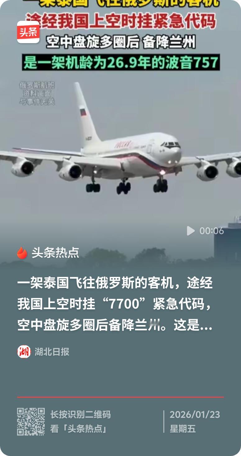 1月23日,俄罗斯蓝色航空一架波音757客机可把人吓坏了。这架从泰国普吉飞往俄罗斯巴瑙尔的航班,在途经我国时发出求救信号。原来是飞机右侧发动机故障,机组宣布遇险、设置应答机编码7700后,决定备降兰州中川国际机场。 这架机龄26.9年的飞机上有239名旅客和7名机组人员。北京时间16时51分,航班安全落地,机上无人受伤。此前还有网友称航班在四川上空挂出“7700”紧急代码,飞常准显示飞机下午2点半后高度下降、空中盘旋。其实2025年12月也有飞机因发动机失效备降中川机场,好在最后都化险为夷。 俄失事客机