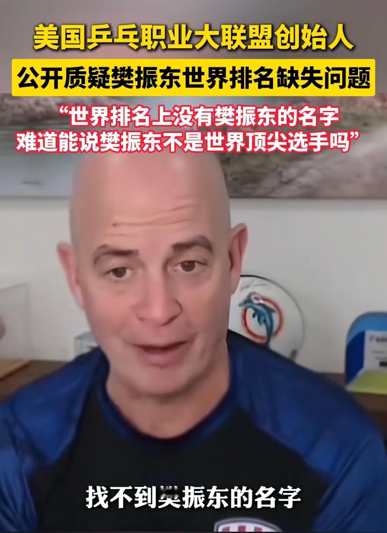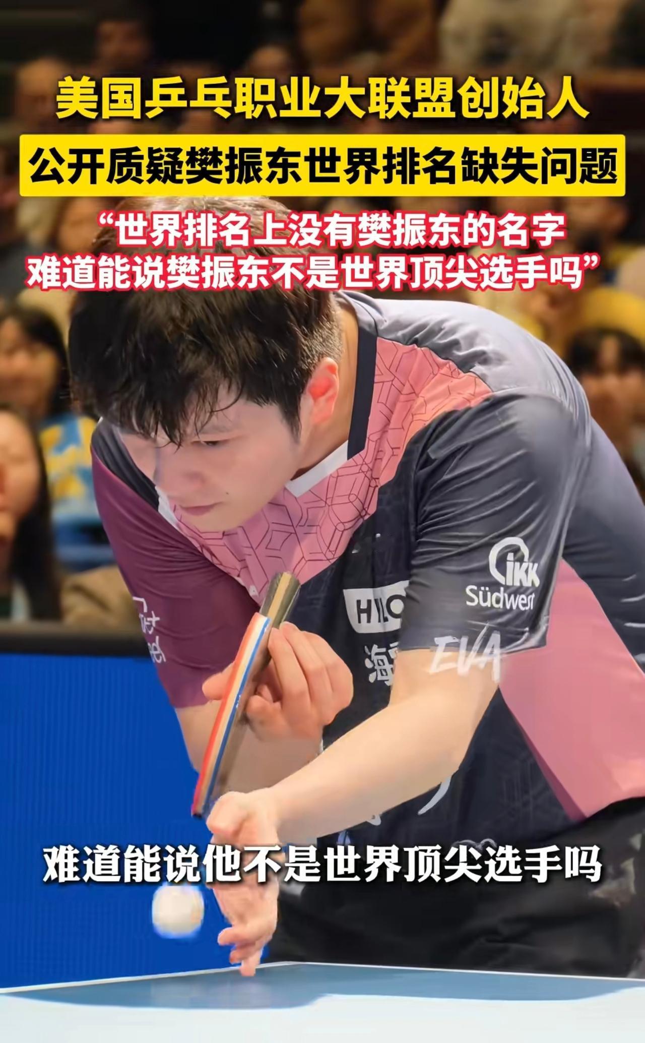 终于有人质疑樊振东世界排名了,因为虽然江湖上没有他的排名,但是却都是他的传说。 乒乓球世界排名按积分计算,就是大小赛事打的越多赢的越多,那么排名越靠前,但是全年为了赛事奔波,对运动员损伤较大,所以很多运动员只能被动接受,如果没有排名就无法参加各大赛事。 美国乒乓职业大联赛创始人说,世界排名上找不到樊振东,难道就代表他不厉害吗,这样的排名是不是很有问题。目前现役的运动员中,获得的荣誉谁有他多,他的国际影响力谁有他大,可是偏偏他国内没有球打,真是讽刺。樊振东 樊振东大满贯 樊振东巴黎奥运