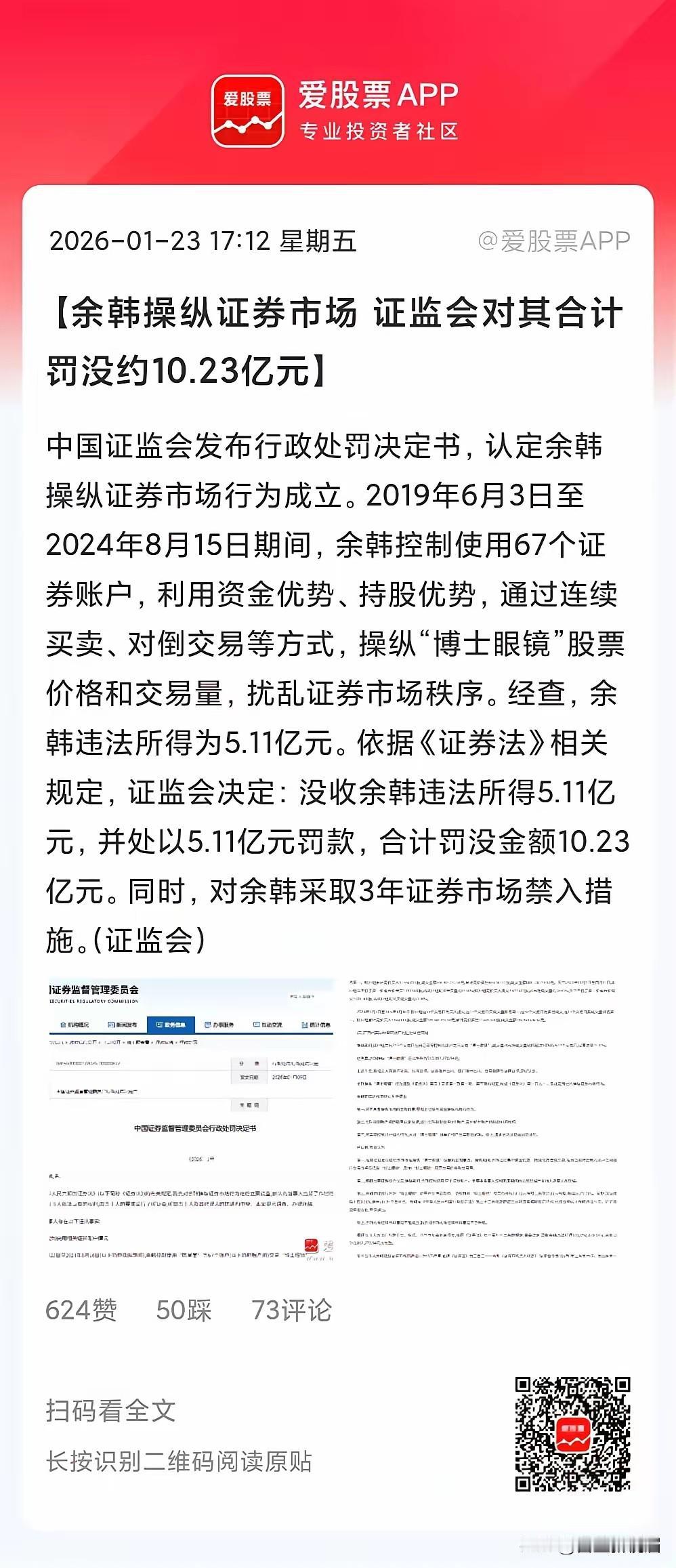 余韩被罚10.23亿! 余韩用5年时间,67个账户,操纵“博士眼镜”,获利5.11亿。 证监会这次处罚相当给力,对净化资本市场起到很大的震慑作用。 股市乱象不用重典,仅靠罚酒三杯是行不通的了,还应该罚的他倾家荡产,终身禁入市场,才能让违法者有所收敛。 这次证监会终于做了一次我想做却没有权力做的事,点赞证监会!