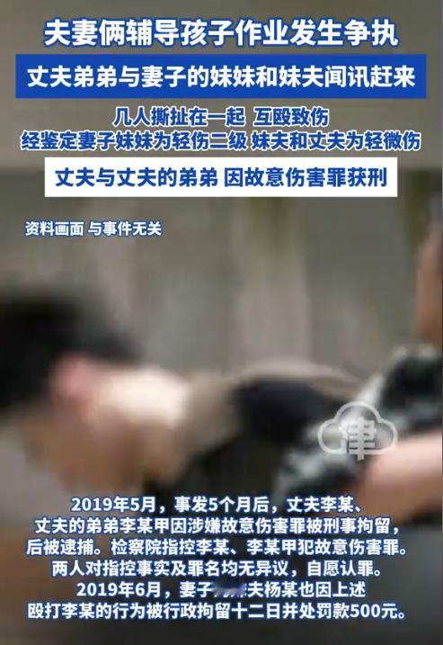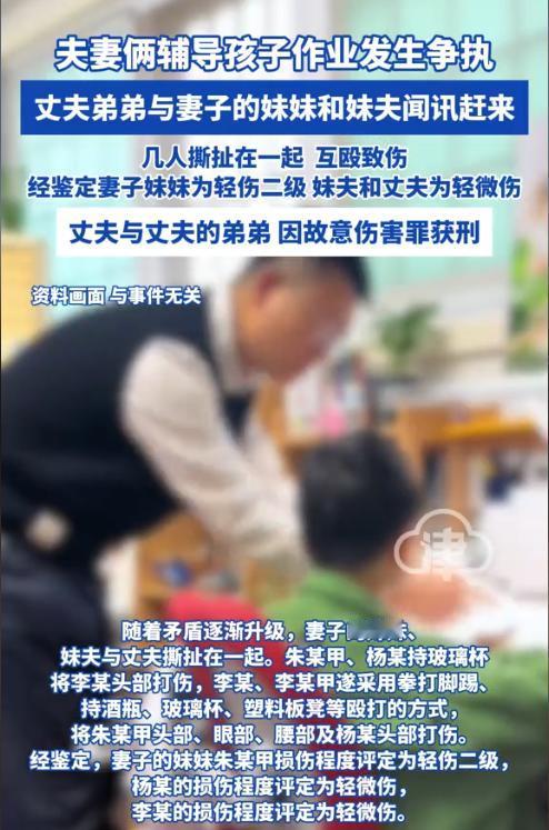 山东临沂,一男子和妻子因辅导孩子作业发生争吵,男子的弟弟过来劝架,谁知二人刚平息怒火。妻子的妹妹和妹夫闻讯赶到,妻妹辱骂了男子,妻妹夫拿玻璃杯砸破了男子的头。男子和弟弟气得持酒瓶和板凳将妻妹和妻妹夫一顿暴走,结果男子和弟弟被刑事拘留,而妻妹夫仅被行政拘留。目前,法院已作出判决。(来源:津云) 2019年年初,男子李某在家辅导孩子功课,讲了三遍孩子还是一脸懵,火气“蹭”地一下窜上脑门,摔了孩子的笔然后怒骂了几句。 妻子朱某认为李某的教育方式不好,就当场指责李某能不能好好教,不愿意教就滚。 李某本就在气头上,朱某这些话无异于火上浇油,随后夫妻两个就开始吵了起来。 李某的弟弟李某某听到动静后,第一时间前来劝架,他一边拉着李某的胳膊,一边给朱某赔笑脸,好说歹说把夫妻俩人的火气给按了下去。 可谁能想到,朱某的妹妹朱某某和妹夫杨某得知二人吵架也赶了过来。朱某某自然是要维护姐姐朱某的,而杨某作为妹夫自然也要维护朱某。 因此,朱某某一上来就指着李某的鼻子开始狂飙脏话,就连带劝架的李某某也被骂了。 李某本来压下去的怒火,被朱某某这一骂,瞬间又炸了,于是和朱某某吵了起来。 杨某见妻子被吼,就推搡了李某一下。朱某某则顺手抄起桌上的玻璃杯,狠狠砸向李某的脑袋,导致李某的额头见了红。 这一下导致场面彻底失控,李某某见哥哥挂彩了,红着眼冲上去与杨某殴打了起来,李某看到弟弟为自己出头,也冲了上去,兄弟二人对着杨某就是一顿打。 期间,朱某某为了保护丈夫杨某,对着李某和李某某又抓又挠。李某随手抓起一个酒瓶子以及塑料板凳对着杨某就砸,李某某连带朱某某也一块儿揍了。 等警方赶到现场时,家里已经一团糟,地上都是玻璃碎渣和血迹。 后经鉴定,这一架打得很惨烈,朱某某的头部、眼部、腰部多处受伤,达到了轻伤二级。杨某和李某均为轻微伤。 5个月后,李某和李某某兄弟二人因涉嫌故意伤害罪被警方逮捕,而杨某只被行政拘留了12日,罚款500元。 《刑法》第234条规定,故意伤害他人身体,致人轻伤的,处3年以下有期徒刑、拘役或者管制。 在法律上来讲,“轻伤”的伤情其实一点都不轻。比如:肋骨骨折2根以上就可以认定轻伤二级,而只要达到轻伤二级,就构成了故意伤害罪。 本案中,虽然朱某某和杨某有错在先,但他们没有把李某兄弟二人打成轻伤,而李某兄弟却把朱某某夫妇二人打成一个轻微伤,一个轻伤二级,所以他们的行为的确构成了犯罪。 很多网友不服,认为是小姨子先挑事,所以应当无罪。 但从法院掌握的证据来看,李某和李某某兄弟二人的确构成了犯罪。 不过法院考虑到李某某和李某到案后认罪认罚,且在朱某某和杨某赶到李某家时,李某某已经劝和了,矛盾的计划是因朱某某和杨某引发。 因此,法院认为朱某某和杨某存在一定的过错。 最终,法院判决李某有期徒刑1年,判决李某某有期徒刑6个月。 最后,不管是亲姐妹、亲兄弟之间,还是要有一些边界感的,不要去胡乱掺和人家夫妻的家务事。而一旦遇到矛盾,也要控制住自己的情绪,要多想想后果。毕竟打赢了赔钱坐牢,打输了住院受罪。 忍一时风平浪静,退一步真的能海阔天空。 对此,您怎么看?欢迎留言交流。