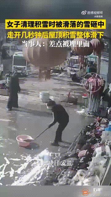 安徽一名女子在清理地上的积雪时,突然被屋顶上掉下来的雪块砸中,她愣了一下,随即预感到什么似的,赶紧走开了。 就在女子离开几秒后,屋顶上的积雪居然全部滑落,正好都砸在她刚才站的位置。 事后女子表示,“所幸跑得快,不然要被埋在下面了。” 网友看完这段视频,都觉得这名女子面对突发状况,还是挺聪明的。 当时这名女子正站在屋檐下打扫地上的积雪,刚好被屋顶上滑落的小雪块砸中,她虽然愣了一下,但也及时地走开了。 如果她没有走开,那么接下来如洪水一般倾泻而来的雪块,就会全部砸在她身上了,到时候后果难以想象,毕竟雪块也是有重量的,并且数量很多,或许会被砸伤也未可知。 相信这件事也给所有人提了一个醒,那就是没事千万不要站在屋檐下,也不要站在头顶有重物的地方,比如风扇和吊灯,万一砸下来,那真的非常危险,所以自己要时刻注意,保障安全。大家怎么看呢?