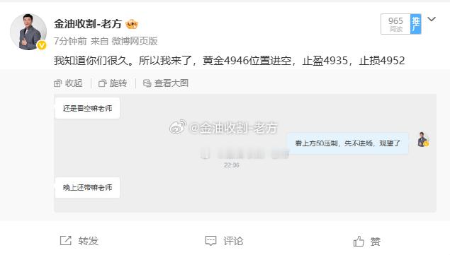 我知道你们很久。所以我来了,黄金4946位置进空,止盈4935,止损4952