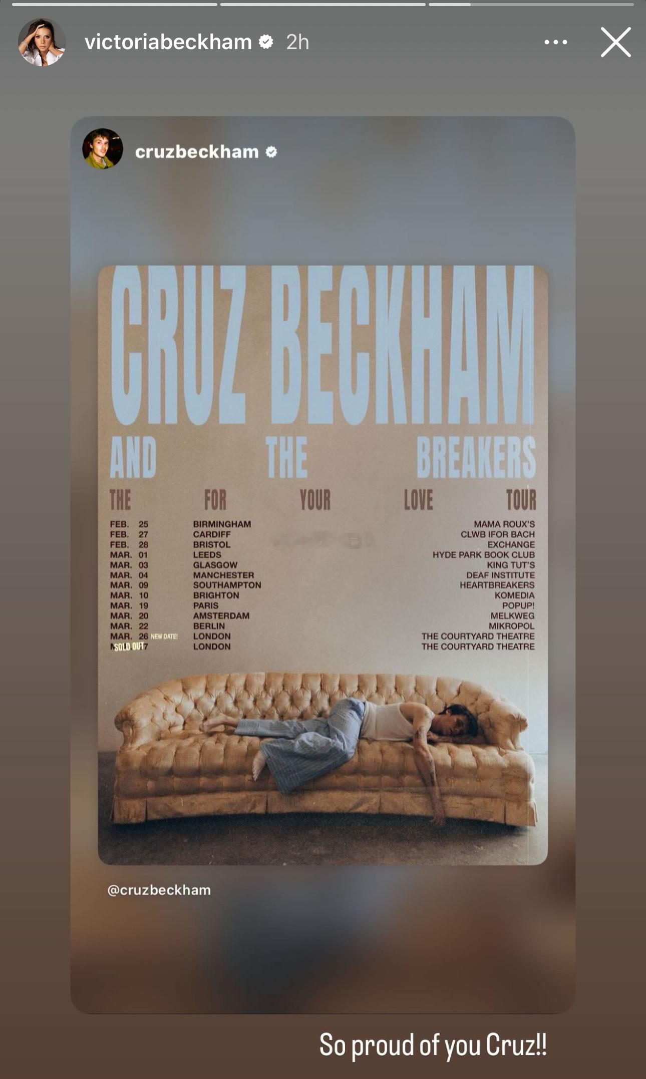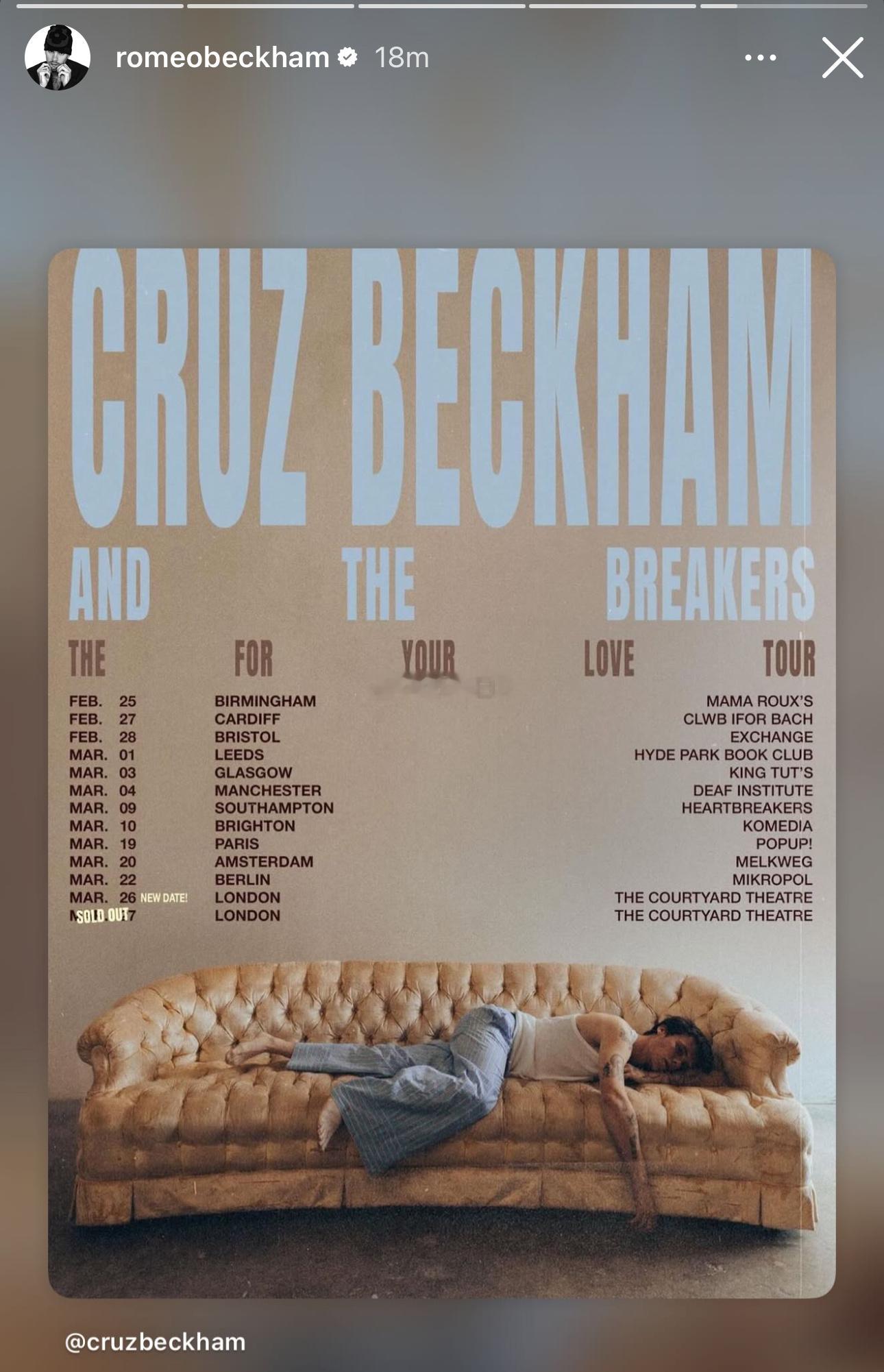 趁着家族drama热度高涨之际,小儿子Cruz在售罄了伦敦场的Live演出门票后🎫立马加了这么多场即将开启他的首次小型巡演👇(从英国各地到法国到荷兰到德国再回到伦敦)(全家上阵转发支持)(就是……真的会有这么多人抢票么)