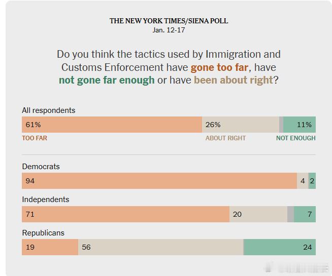 民调显示,美国选民对驱逐移民问题意见分歧,但普遍厌恶ICE的作法 《纽约时报》/锡耶纳大学的民调显示,支持特朗普处理移民问题方式的选民比例,自他第二任期开始以来略有下降。 同时,表示“强烈不满”的比例上升至48%,去年四月这一比例为39%。拉美裔选民比黑人或白人选民,更可能将移民视为美国当前面临的最重要问题。 但更多拉美裔表示,他们认为经济问题更为重要。 在特朗普处理美墨边境事务方面,拉美裔选民意见几乎均分,但他们对ICE的执法方式压倒性地表示不满,并认为这个机构做得太过分。热点观点海外新鲜事