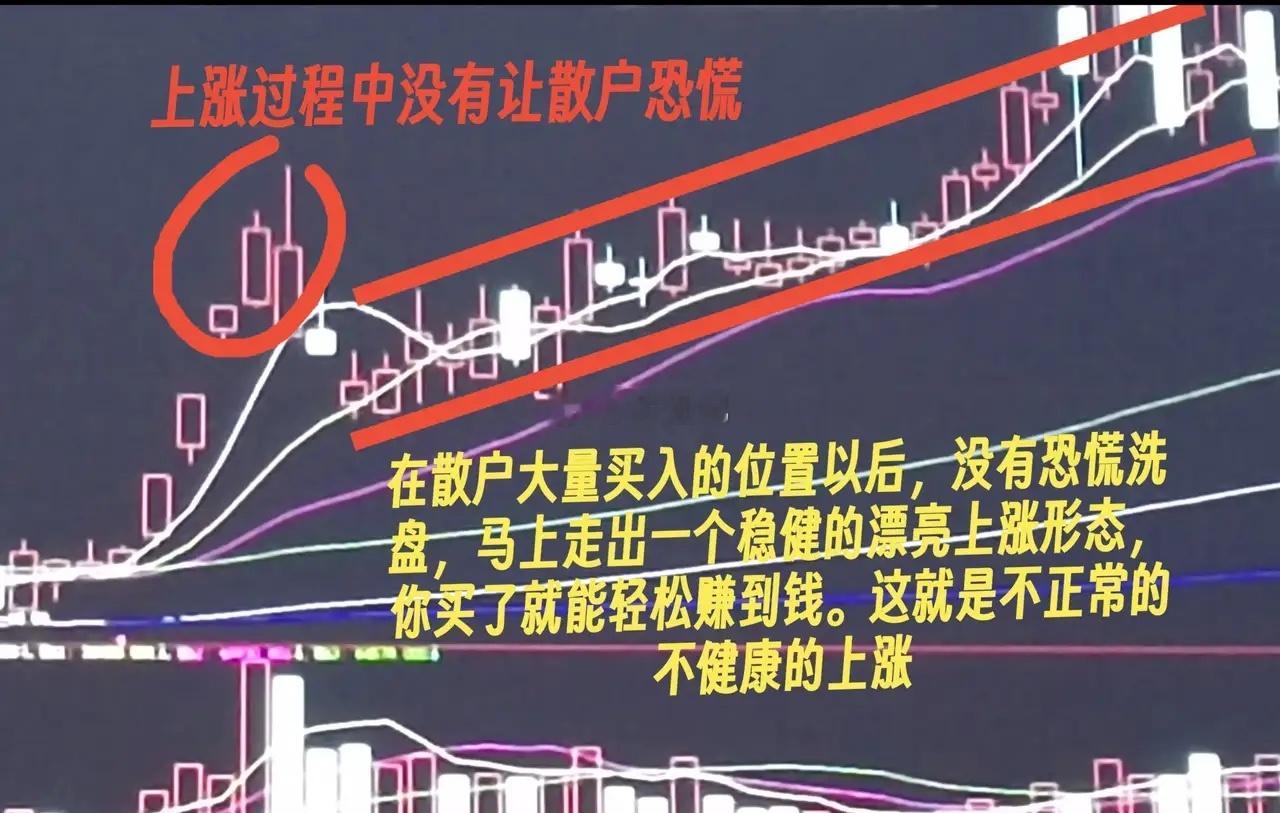 什么样的上涨是不正常不健康的?一只股票从底部涨上来,有很多种方式,有正常的也有不正常的。什么样的上涨是不正常不健康的?就是涨了以后,吸引散户注意了,不再把散户洗下去,没有让散户感觉到害怕恐慌而卖出的形态,而是一直带着散户挣钱。正常的上涨,也是健康的上涨,就是涨了,吸引到散户注意,形态好看以后,就马上打坏这种好看的形态,开始调整,下跌,要把在好看位置买入的散户洗出去,洗盘具有连续性。这就是健康的上涨。