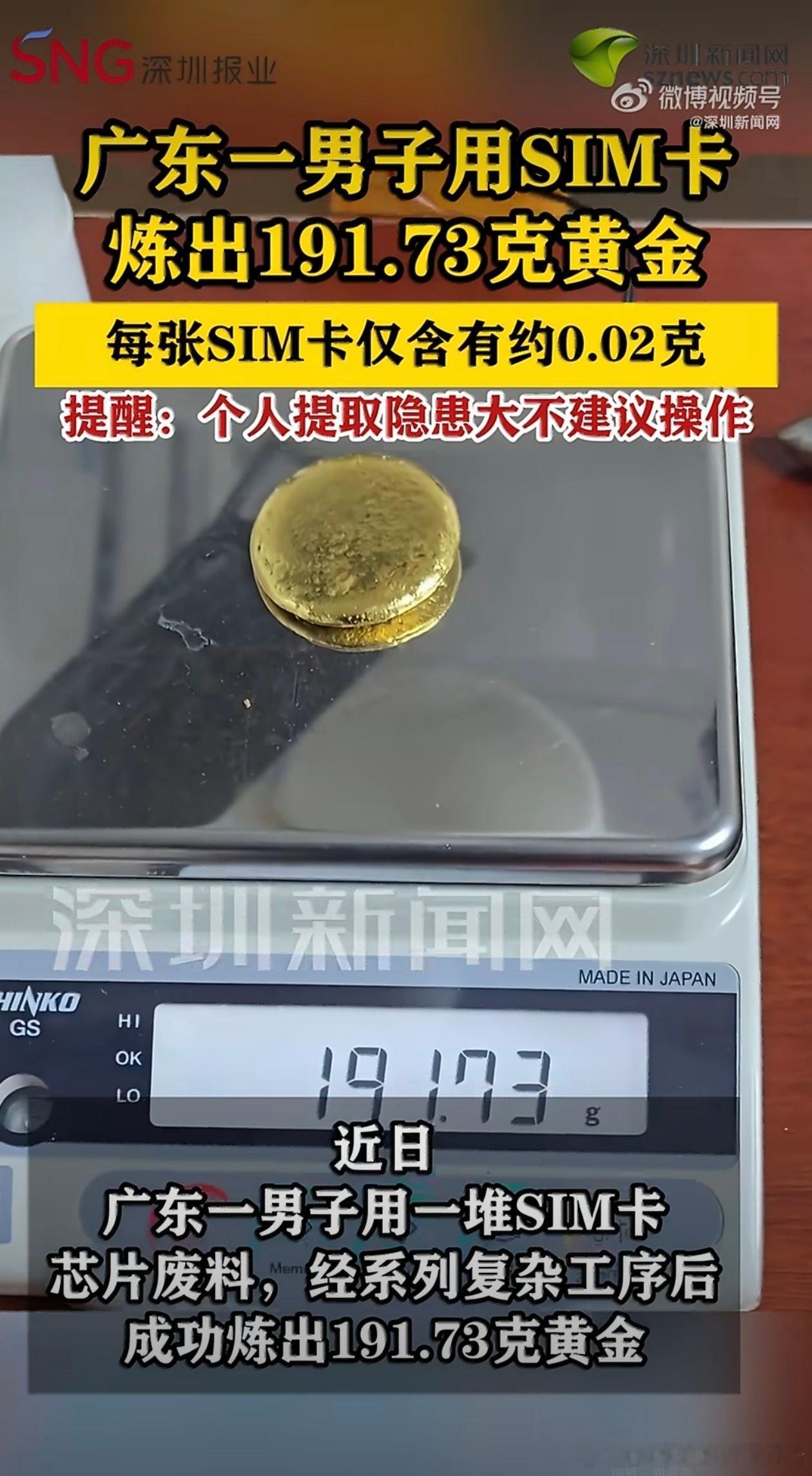 不建议个人用SIM卡提炼黄金sim提炼黄金好像之前就有人干了,一个卡只有0.02g左右的黄金,想靠这个提炼也不容易。之前还有拆手机之类的,都是为了赚钱。