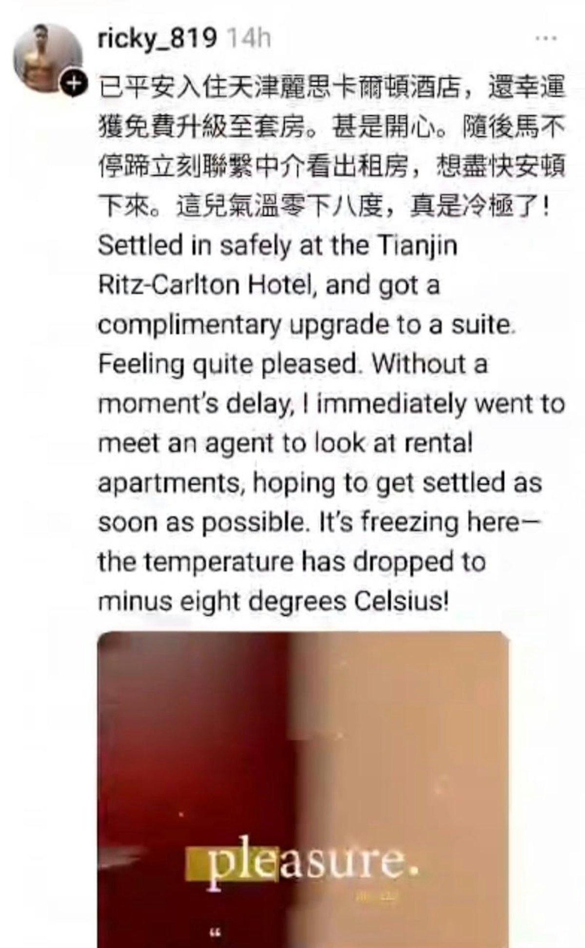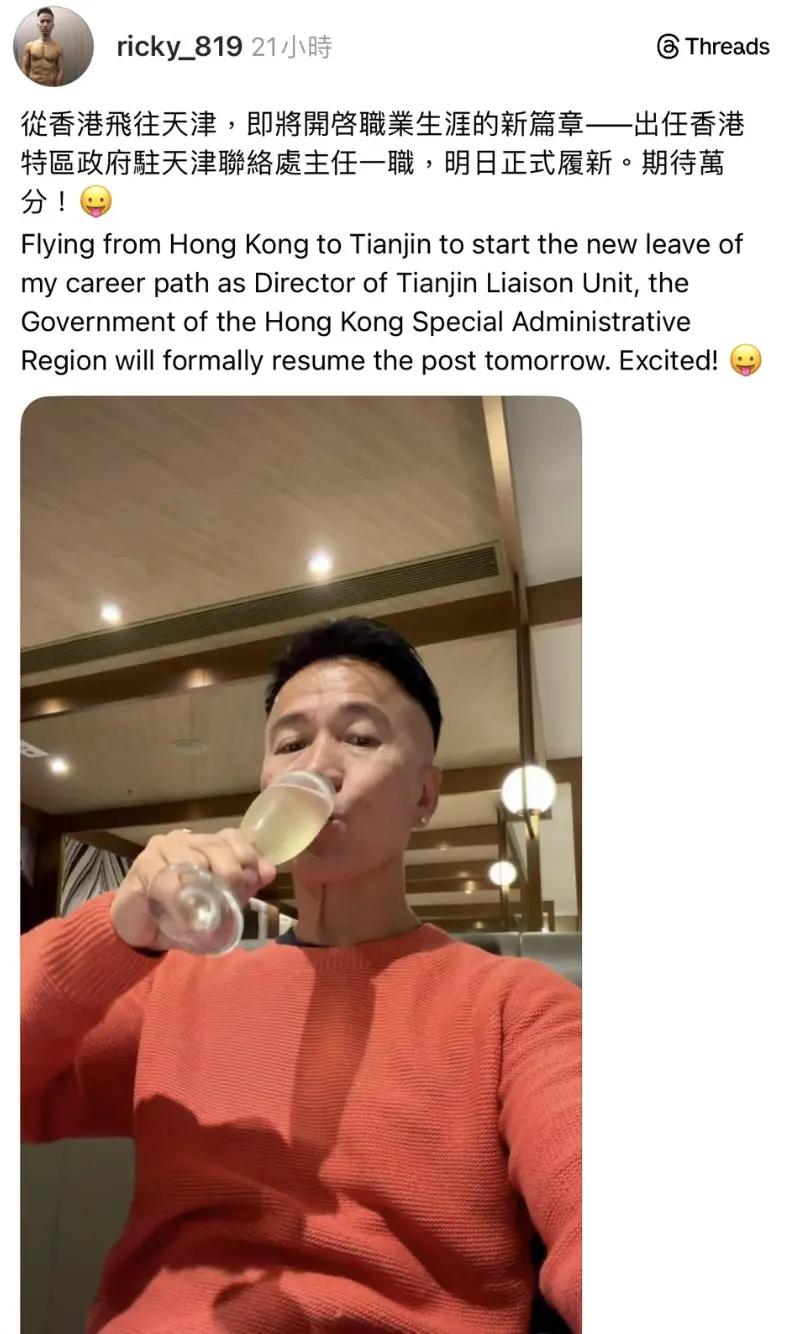 港府驻天津联络处主任郑震生,被揭在网上分享获喷射飞航高层朋友安排乘坐私人舱室去澳门,事隔一日被终止合约! 他在天津工作期间,被揭发曾经在网络分享入住天津酒店的片段,自称获免费升级至套房;而他到天津之前是驻福建联络处主任。 去年5月,他也曾经在社交网站自称获喷射飞航高层朋友安排,乘坐私人舱室去澳门,目前有关帖文已被删除。 港府政制及内地事务局昨晚深夜公布,经进一步调查,认为郑震生乘船前往澳门时座位获「升级」事件,有违反《防止贿赂条例》,决定即时终止其合约。