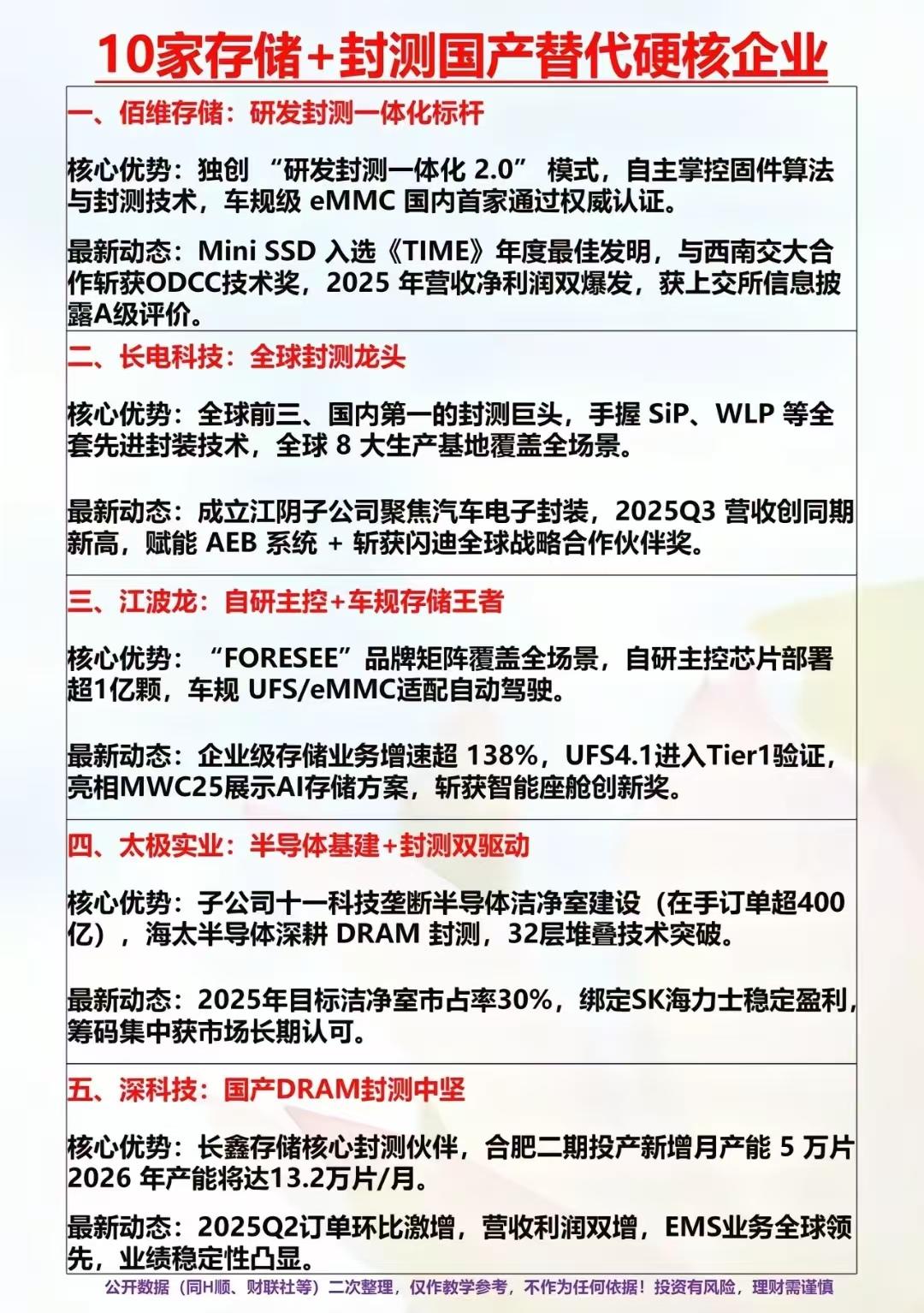 硬核突围!10家存储+封测国产替代龙头全梳理 在全球半导体竞争加剧的当下,国产替代已成为不可逆的产业浪潮,而存储与封测作为芯片产业链的核心环节,更是突围的关键战场。这10家硬核企业,正凭借技术突破与产能升级,在全球产业链中站稳脚跟。 全球存储芯片市场供需缺口持续扩大,叠加AI算力需求爆发,行业已进入“超级牛市”。Counterpoint Research数据显示,2026年第一季度存储芯片价格将上涨40%至50%,第二季度继续上扬约20%。相关概念龙头企业有哪些? 长电科技作为全球封测前三的龙头;佰维存储独创“研发封测一体化2.0”模式,车规级eMMC获权威认证;江波龙自研主控芯片部署超1亿颗,企业级存储业务增速超138%。 从太极实业的32层DRAM堆叠技术突破,到深科技长鑫核心封测伙伴的产能跃升,从兴森科技绑定华为昇腾的FCBGA基板突围,到华润微车规芯片的持续突破,再到蓝箭电子从消费电子向汽车高端封测的转型,这些企业不仅在技术上实现从跟跑到并跑的跨越,更在车规、AI、高性能计算等高端场景中实现批量交付。 随着AI算力需求爆发与汽车电子渗透率提升,存储与封测的国产替代进程正迎来黄金期。这10家企业的技术积累与产能释放,不仅是产业链安全的坚实保障,更将在全球竞争中定义中国半导体的硬核实力。 温馨提示,利好背后仍需警惕各类投资风险,理性研判布局逻辑。理财有风险入市需谨慎!资料取材网络仅供参考不能作为投资依据。