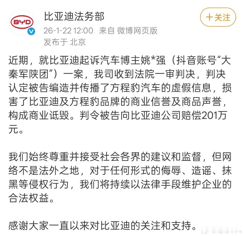比亚迪起诉“姚十八”事件大家都看到了吧?1月22日,“姚十八”被判决赔偿比亚迪201万,原因是抹黑比亚迪、损害比亚迪名誉商誉。法院在依法判决的时候,裁定赔偿方面有着严格的标准,判赔这么多钱,可见“姚十八”抹黑比亚迪有多严重。关于“姚十八”抹黑比亚迪,大家印象最深刻的事件应该是2023年方程豹5刚上市时,“姚十八”故意异常测试豹5,得出“豹5百公里18升油耗”的离谱结论。更离谱的是,“姚十八”曾是某车企沙漠学院院长,跟之前同样被判赔偿比亚迪200多万的“龙猪集车”,被外界认为是某车企“拉踩同行”的典型。比亚迪打击黑公关的一个重要工作,就是打击这些典型,依法维护自身权益。幸好豹5的产品力够强,虽遭到持续抹黑,但凭借产品力征服了市场,方程豹已经成为新能源越野的代名词,累计销量已突破30万辆,豹5、豹8、钛7、钛3成为热门车型。方程豹胜诉姚十八