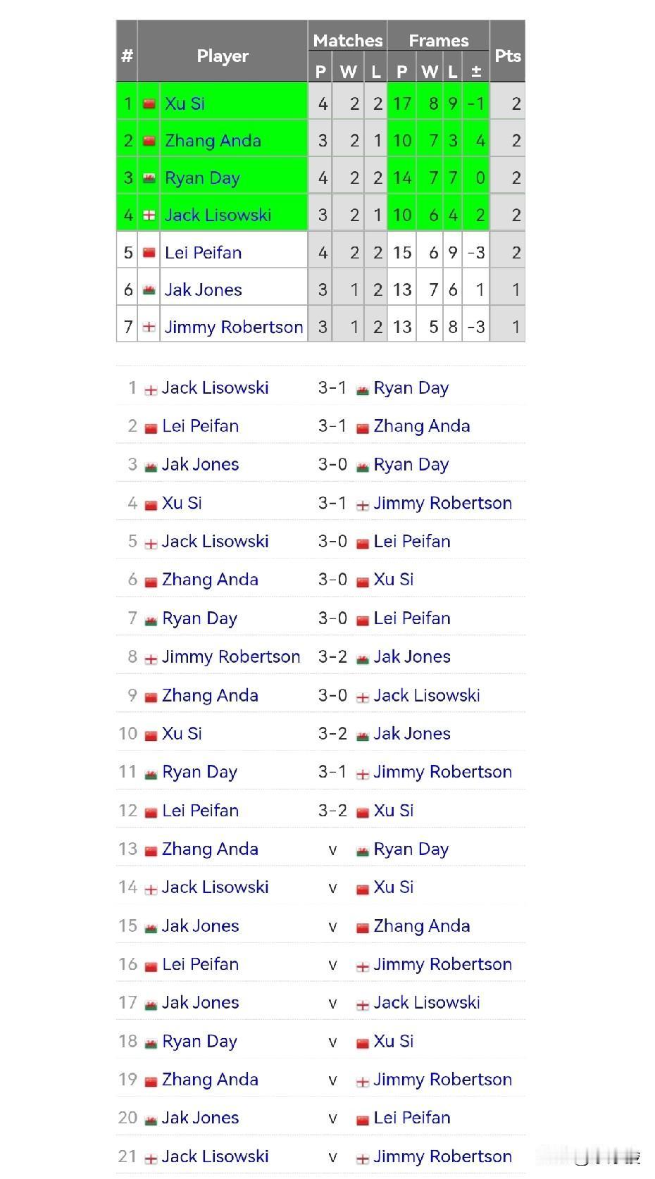 冠军联赛第七组首日战报,徐思暂列第一,张安达第二,雷佩凡第五。明天凌晨决出冠军。 首个比赛日之后,分差没有拉开,徐思、张安达、瑞恩·戴、小司机、雷佩凡均积2分,分别排在第一到第五,杰克·琼斯和吉米·罗伯逊积1分,排在最后两位。 目前徐思、瑞恩·戴、雷佩凡已经战罢4场,其余球员战罢3场。今天继续进行小组赛,明天凌晨进行半决赛和决赛。 本组实力相对均衡,竞争比较激烈,希望中国球员能笑到最后。