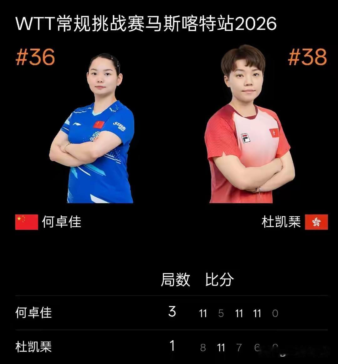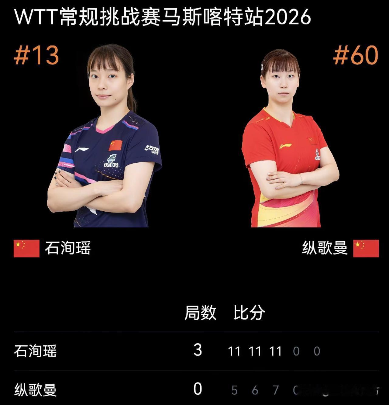 WTT常规挑战赛马斯喀特站两场女单半决赛,石洵瑶和何卓佳分别击败队友纵歌曼和中国香港老将杜凯琹,成功会师决赛,为国乒提前包揽冠亚军。