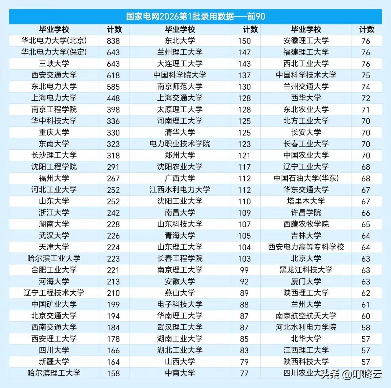 刚刚出炉!国家电网26年第1批录用高校毕业生排行榜!录用人数前90名全揭秘![烟花][烟花][爆竹][爆竹] 报哪些大学,容易进国家电网? 我们来看看哪些高校毕业生录用人数最多?依然是华北电力大学、三峡大学、西安交通大学618人毕业生录用人数位居前三名!清华大学125人,北京大学63人!这三所985的毕业生录用到国家电网,找到了合适工作,实现了人生梦想!哈哈,这简直成了冷笑话!速速围观揭秘详细内容![点亮平安灯][点亮平安灯] 欢迎关注@叮咚云 将优先为粉丝职业规划指导,1对1咨询是付费服务,为你定制最适合的就业择业方案!欢迎留言交流讨论。[来看我][来看我] 免责声明:图片来自网络,仅供参考! 国家电网求职 电网院校