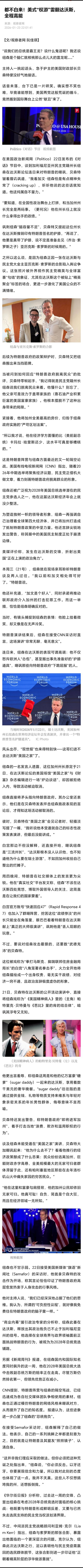 #美财长炮轰加州州长护主特朗普# 【#美式权游雷翻达沃斯#,全程高能】#79岁的特朗普生气狂发80条帖子# 美国政治新闻网(Politico)22日发布的《对话》节目中,谈到加利福尼亚州民主党籍州长纽森在达沃斯论坛连日来对特朗普的嘲讽,贝森特皱着眉讥讽道,“我看加文·纽森怕是有点精神失常了(cracking up),听听他说的这些话就知道。他这纯属自不量力。”“要知道,在全国性政治舞台上打拼,和当加州州长完全是两码事。(更何况)他在州长任上就没什么拿得出手的政绩。”当被问到如何回应“特朗普政府脱离民众”的批评,贝森特零帧起手,“我记得就是民主党籍州长纽森说我们脱离民众来着。他懂什么?别忘了,他父亲可是效力于盖蒂家族的(靠石油产业积累巨富的美国富豪家族)。他根本摆脱不了这种出身带来的局限。”紧接着,他将加州全美最高的房价,归咎于纽森政府实施的“严苛区划法案”。“所以我才说,他在经济学方面懂的比(美前副总统)卡玛拉·哈里斯还少,这水平可真是够糟糕的。”