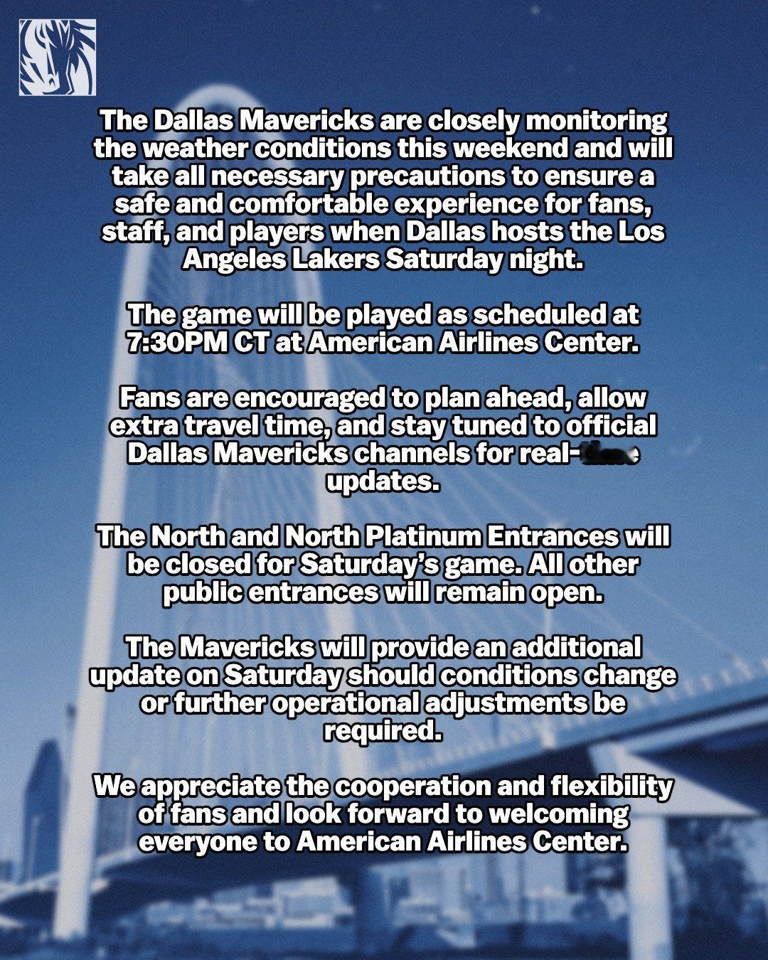 独行侠官方发布公告,明天与湖人的比赛将按原计划进行。独行侠正在密切监测本周末的天