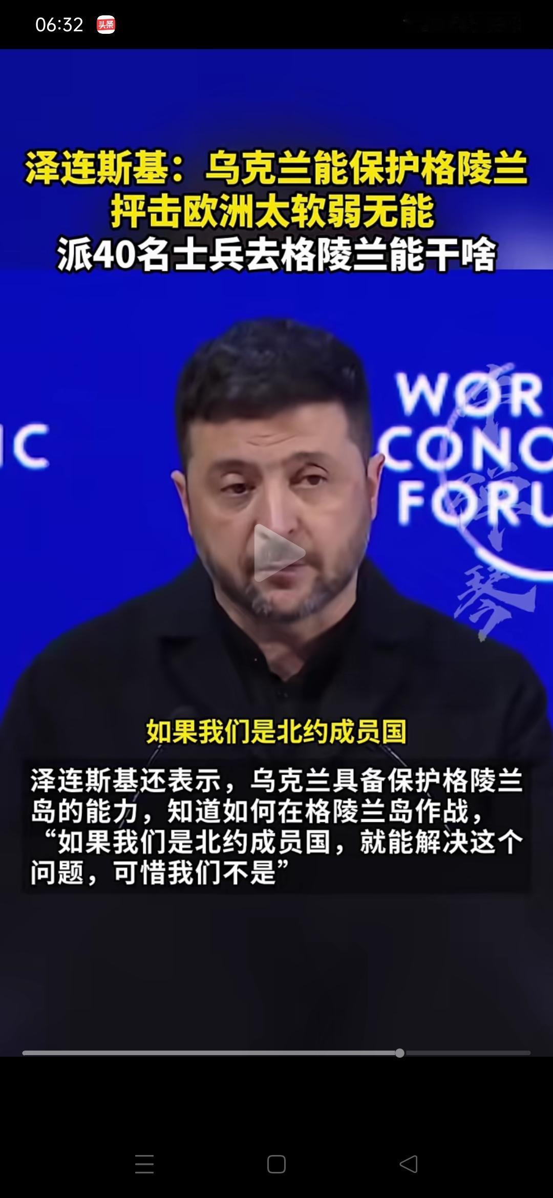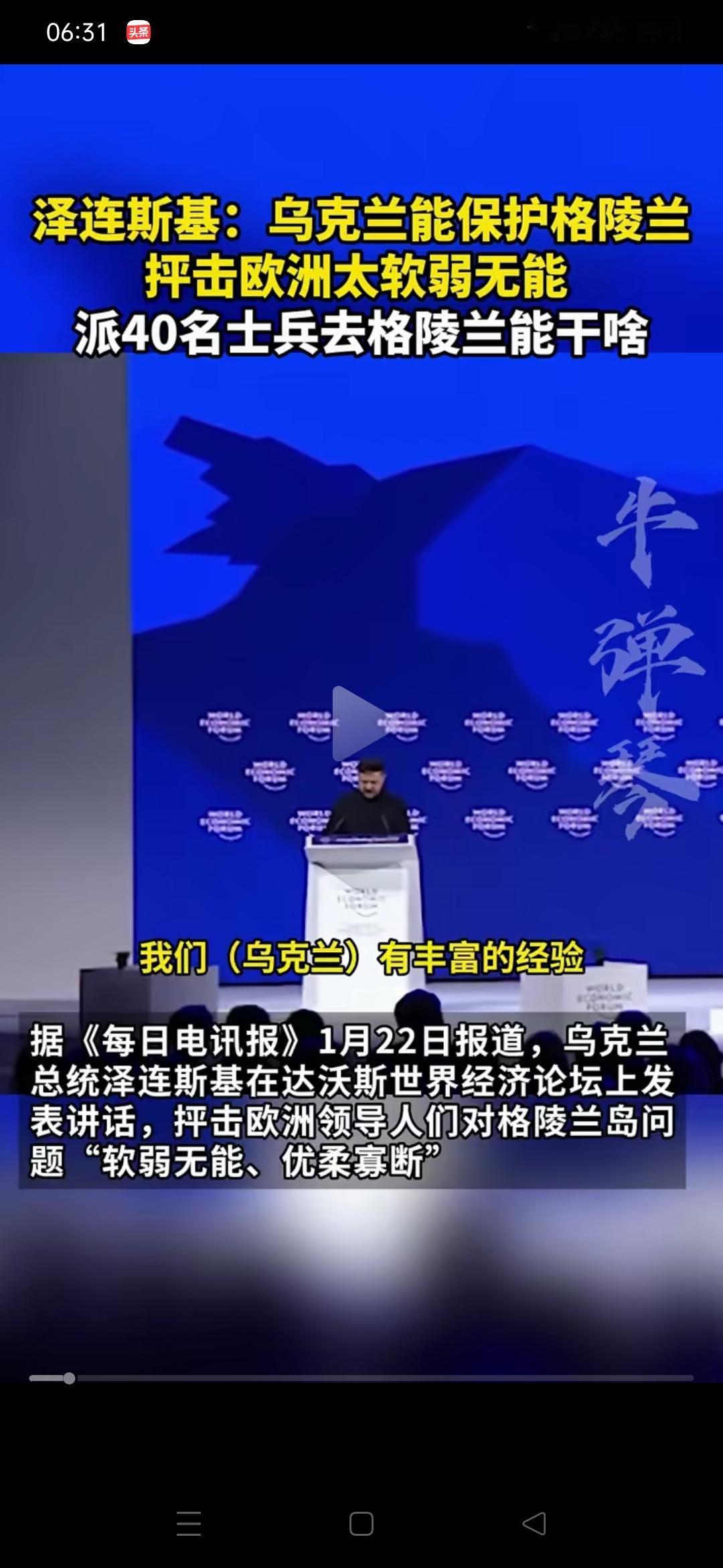 泽连斯基称乌克兰能守格陵兰岛,此话得罪八方,智商瞬间清零! 据英国广播公司报道,乌克兰总统泽连斯基当天在达沃斯世界经济论坛上发表讲话时表示,乌克兰具备保护格陵兰岛的能力,“我们知道如何在那里作战”,前提“如果我们是北约成员国,就能解决这个问题,但我们不是”。 聪明的泽连斯基这是在提醒欧洲,让我加入北约,保卫格陵兰岛的任务就交给乌克兰了。这是在吹牛皮,连自己国家都保护不了,何谈保护格陵兰岛。 泽连斯基自以为聪明,实则成了傻子!开玩笑不能开到国际上去。 美国第一个不愿意听,这不是和我对着干吗?你乌克兰还需要我美国的保护呢。 欧洲也不愿意听,埋汰欧洲只派出37人的队伍,你乌克兰和俄罗斯对打,是我们欧洲给钱给物给呼吁,没有欧洲支持,乌克兰早投降了! 泽连斯基最新表态 北约 国际政治 美国占格陵兰岛