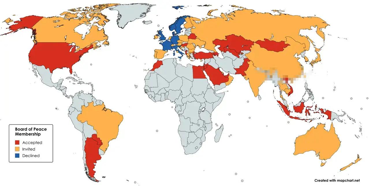 特朗普的“和平委员会”各方态势图: 红色:入会。 蓝色:拒绝入会。 橙色:已读不回。 欧州的几个传统话事人这一次难得的硬气了一回,在冰岛问题上被特朗普搞的灰头土脸,这次算是挽尊之举。