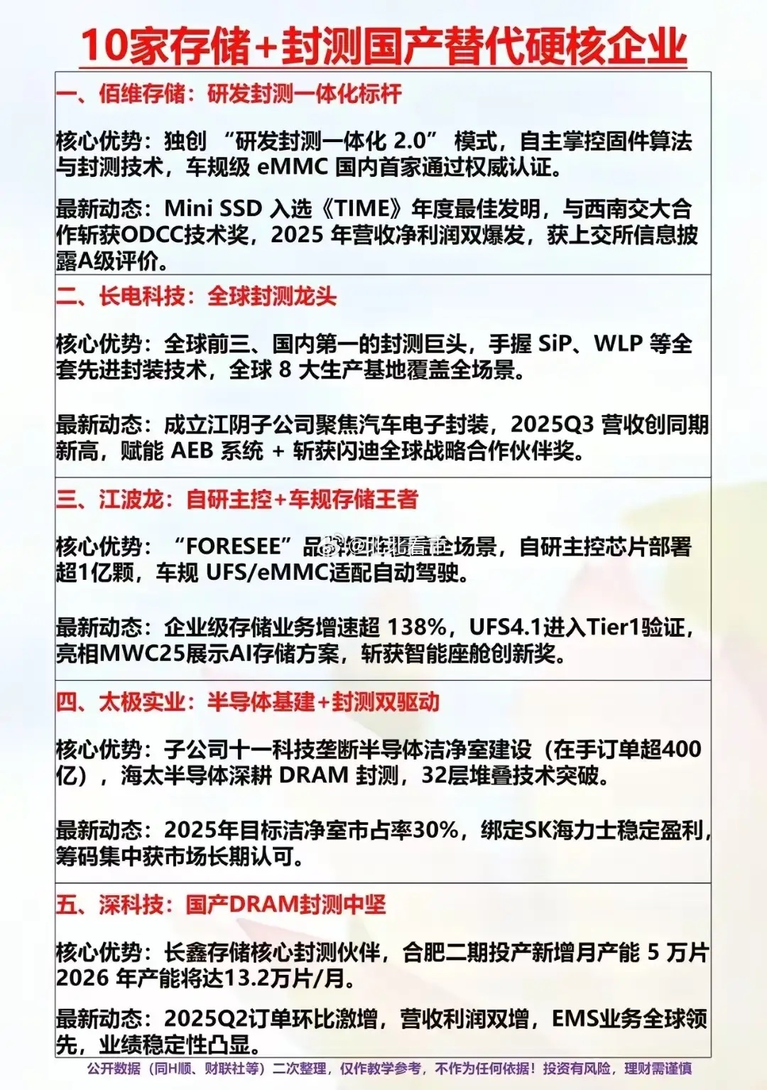 硬核突围!10家存储+封测国产替代龙头全梳理在全球半导体竞争加剧的当下,国产替代已成为不可逆的产业浪潮,而存储与封测作为芯片产业链的核心环节,更是突围的关键战场。这10家硬核企业,正凭借技术突破与产能升级,在全球产业链中站稳脚跟。全球存储芯片市场供需缺口持续扩大,叠加AI算力需求爆发,行业已进入“超级牛市”。Counterpoint Research数据显示,2026年第一季度存储芯片价格将上涨40%至50%,第二季度继续上扬约20%。相关概念龙头企业有哪些?长电科技作为全球封测前三的龙头;佰维存储独创“研发封测一体化2.0”模式,车规级eMMC获权威认证;江波龙自研主控芯片部署超1亿颗,企业级存储业务增速超138%。从太极实业的32层DRAM堆叠技术突破,到深科技长鑫核心封测伙伴的产能跃升,从兴森科技绑定华为昇腾的FCBGA基板突围,到华润微车规芯片的持续突破,再到蓝箭电子从消费电子向汽车高端封测的转型,这些企业不仅在技术上实现从跟跑到并跑的跨越,更在车规、AI、高性能计算等高端场景中实现批量交付。随着AI算力需求爆发与汽车电子渗透率提升,存储与封测的国产替代进程正迎来黄金期。这10家企业的技术积累与产能释放,不仅是产业链安全的坚实保障,更将在全球竞争中定义中国半导体的硬核实力。温馨提示,利好背后仍需警惕各类投资风险,理性研判布局逻辑。理财有风险入市需谨慎!资料取材网络仅供参考不能作为投资依据。