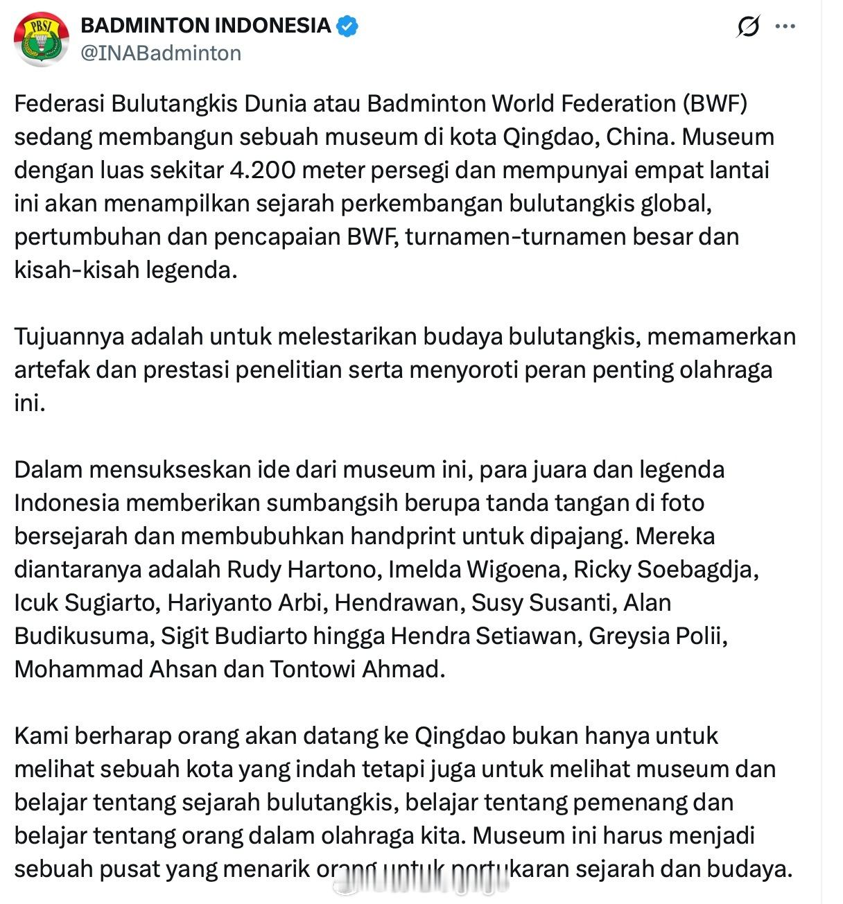 我爱羽球【印尼羽协披露世界羽联博物馆进程,梁海量王莲香亨德拉入榜】世界羽联正在