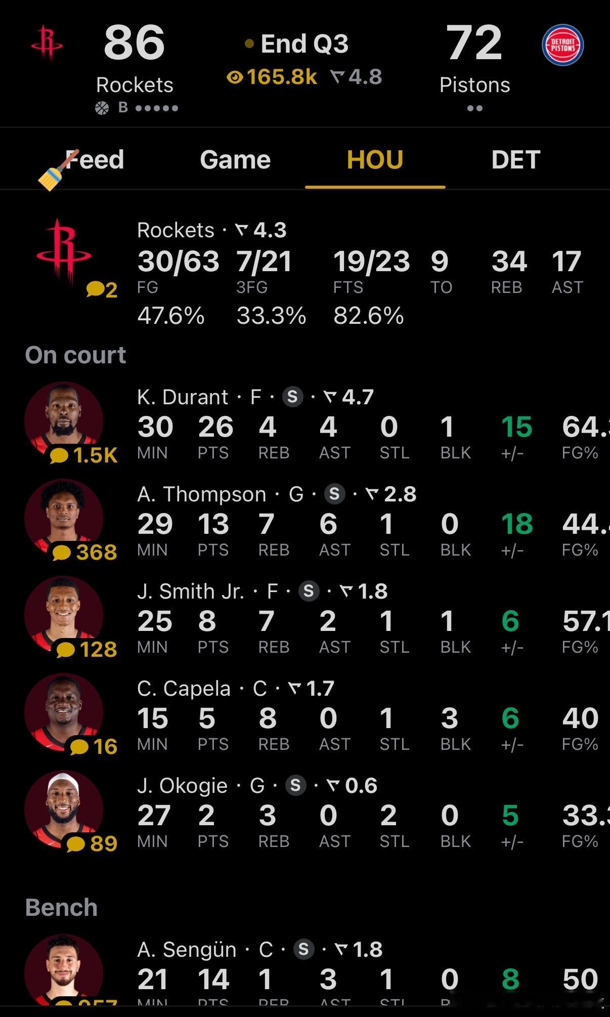 三节结束,火箭领先14分!!!只求杜兰特第四节开局休息的时候,火箭能少输点分给阿杜回来存一点优势阿杜三节26分🔥谢泼德单节5中4拿下10分火箭vs活塞休斯顿火箭休斯顿火箭