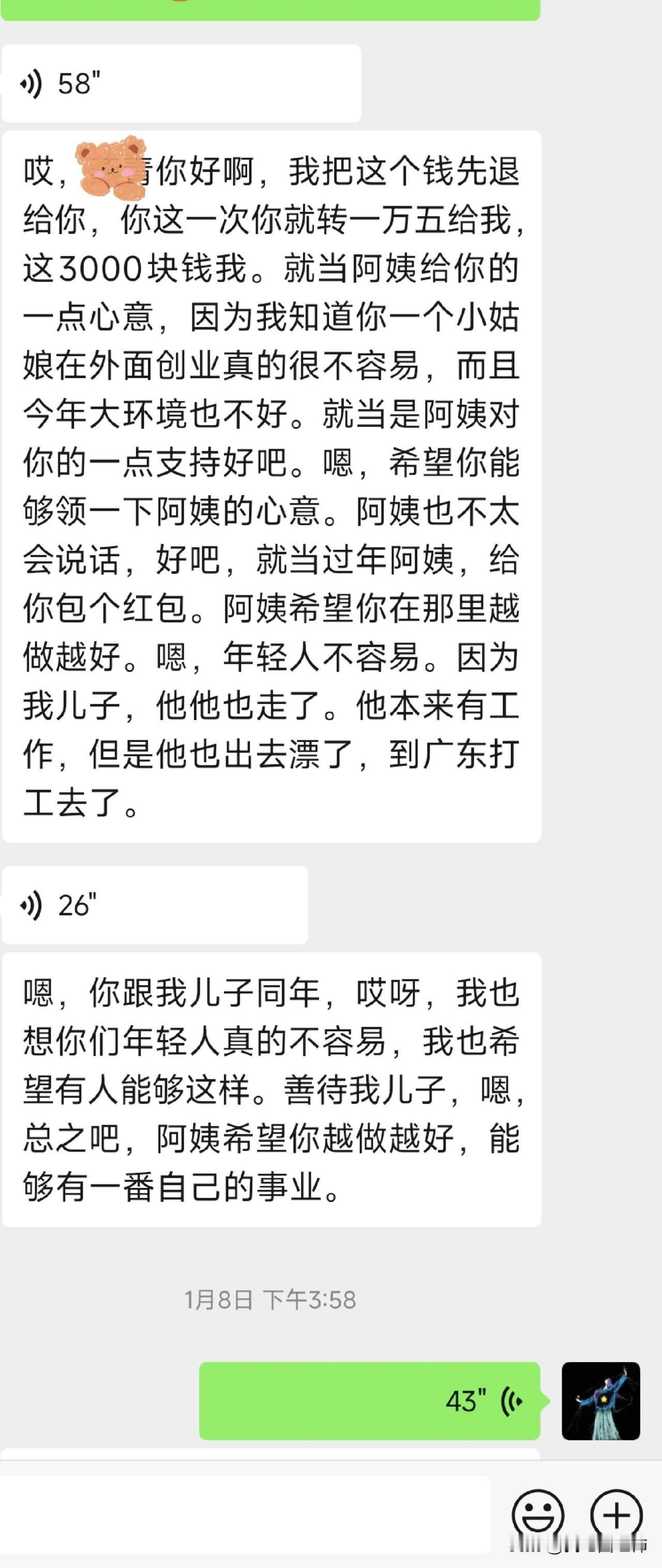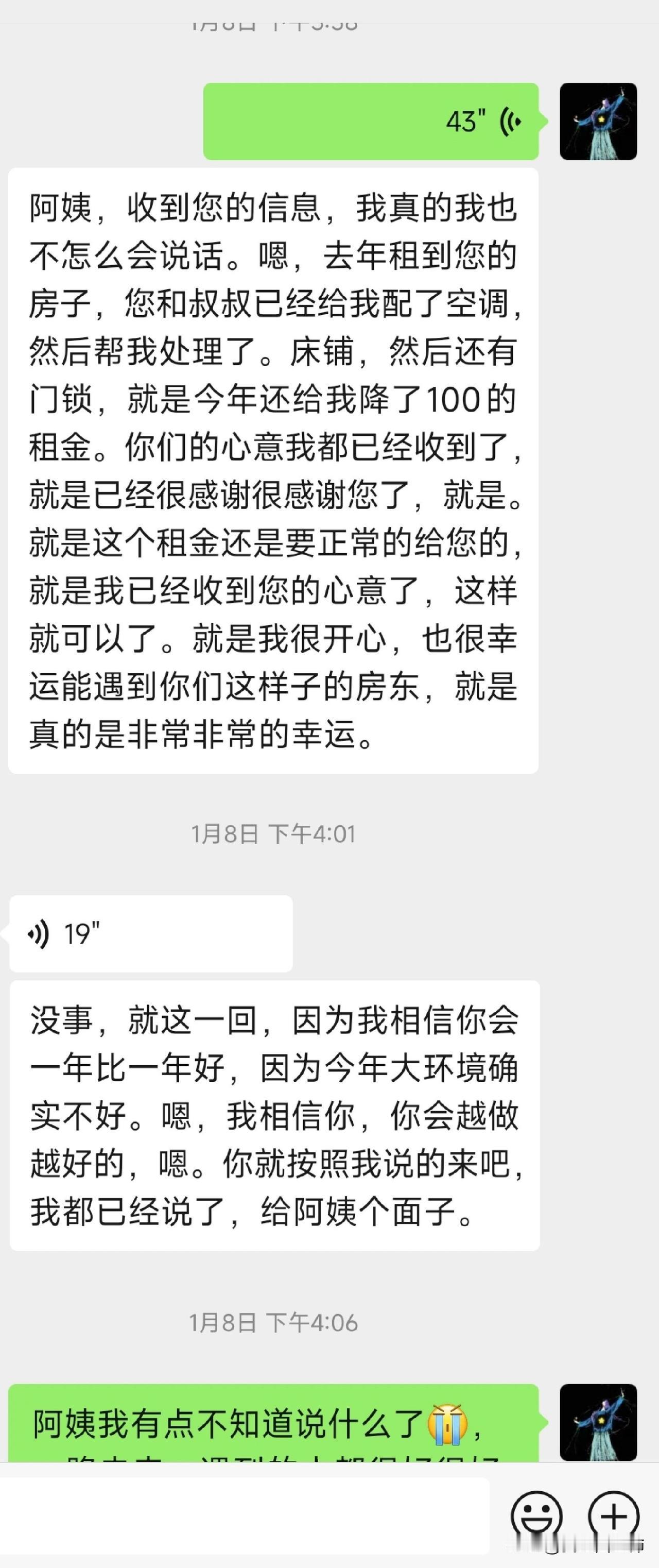 遇到的神仙房东 自己创业的第一年,遇到超级好的房东,在一开始租房的时候遇到很多问题,从城南找到城北,因为是用于工作,所以不需要床品和柜子,很多房东是冲着居住出租的,所以不愿意处理床和沙发。我直到我找到了这套房子,遇到了阿姨,命运的齿轮开始转动,她帮我处理了床,客厅缺了空调也马上给我配了新款,担心我一个女孩子不安全还给我换了2k的智能锁,因为今年大环境不好,年底跟阿姨谈了能否降租100块,阿姨也是马上同意!因为自己不在老家,喊妈妈寄了一些家乡特产给阿姨尝尝鲜。 我是真的没想到,在交租的时候阿姨直接给我减免了3k,把我当亲人一样看待,甚至我们都没有见过面