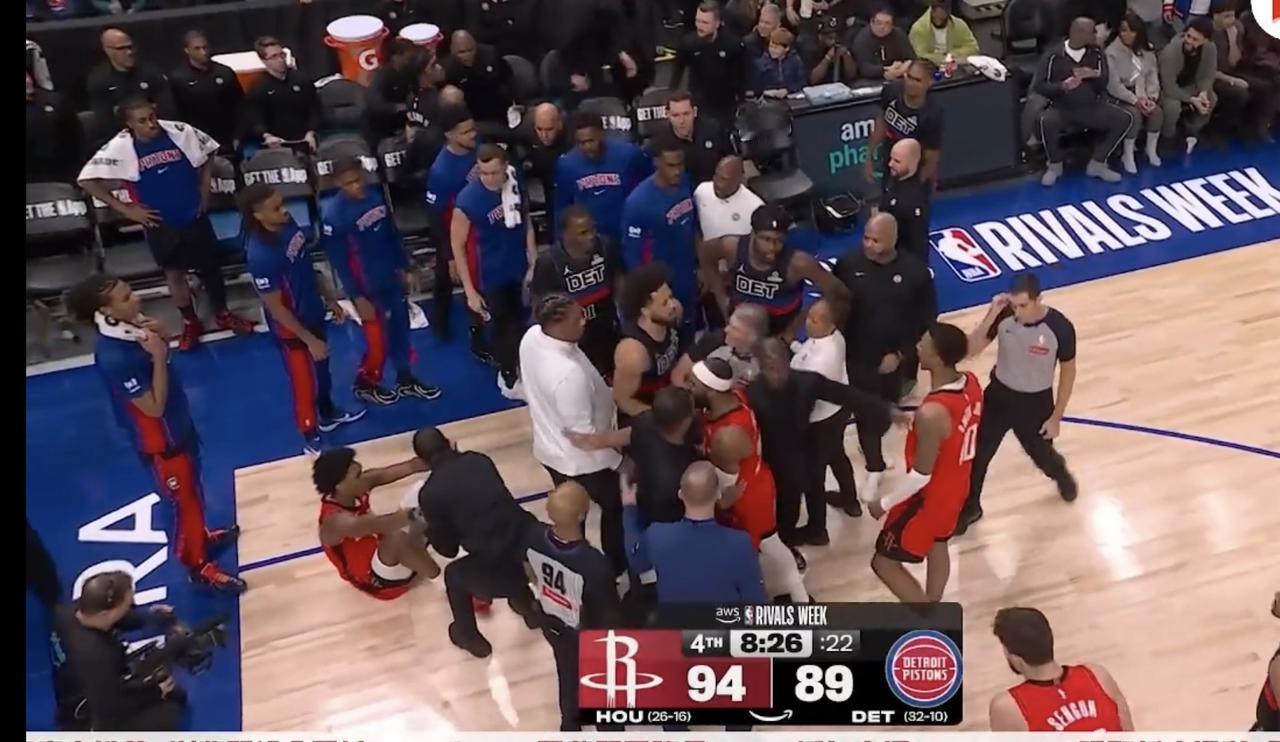 这要是让火箭和活塞在总决赛相遇,那不得场场都NBA➕WWE啊! 赛季第一次交手,小贾和小汤普森发生冲突, 第二场交手,小贾和霍兰也差点发生冲突, 还好裁判和工作人员及时介入! 如果让双方打一轮七场系列赛,那不得场场都打球➕摔跤表演啊!