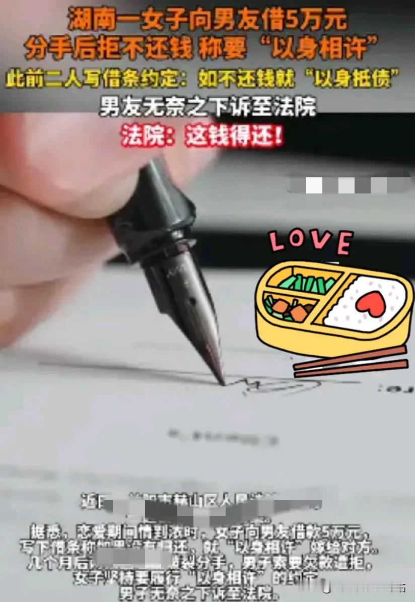 情侣关系闹僵,要钱没有,还不上我就以身相许! 谁也没有想到,湖南一对情侣恋爱期间女子借男友50000元,分手后拒绝还钱。男友无奈起诉,法院依法判决。此事提醒人们,恋爱中经济往来要谨慎,不能仅凭玩笑话处理,需有明确的约定和凭证。 男友长了一个心眼问了一句,“假如你以后还不上钱了怎么办?”女子开玩笑的说:“我可以给你写借条,还不上那我就以身相许呗!”万万没想到,他们的感情才持续了几个月,就出现了逆风,两人就愉快的分手了。 男子都过了而立之年还是单身,家里人为他的亲事操碎了心。让他去相亲,他又放不下面子,非要自己谈,始终找到中意的人。这可把家人愁坏了。 一次偶然的机会,他通过朋友介绍,在公司聚餐时认识了同是单身的女孩。当时两人聊得火热,就加了联系方式,通过聊天两人都觉得对方不错。王八看绿豆,对上眼了,很快他俩就确定了恋爱关系。 相处一段时间后,女孩最近自己手头有点紧,需要资金周转一下,房贷快交不上了。于是女孩便跟男人借五万块钱,说是用来交房贷用。 五万块钱对于种庄稼男孩来说那以是一个天文数字,男孩心想咋两都是情侣关系了,两人甚至还商量好准备年底就结婚。因此,男子没有多想毫不犹豫的就借了。 反转来了,钱还没有借多久,谁也没想到,热恋才几个月,他俩关系还没撑到年底,他们就和平分手结束了。分手后,男孩就让女孩还钱,女孩说现在没有,要不我就以身相许吧? 男孩觉得自己都跟女孩分手了,那是肯定不可能在和她结婚的,于是一纸诉状将刘某告到了法庭。 对此事,你们怎么看!
