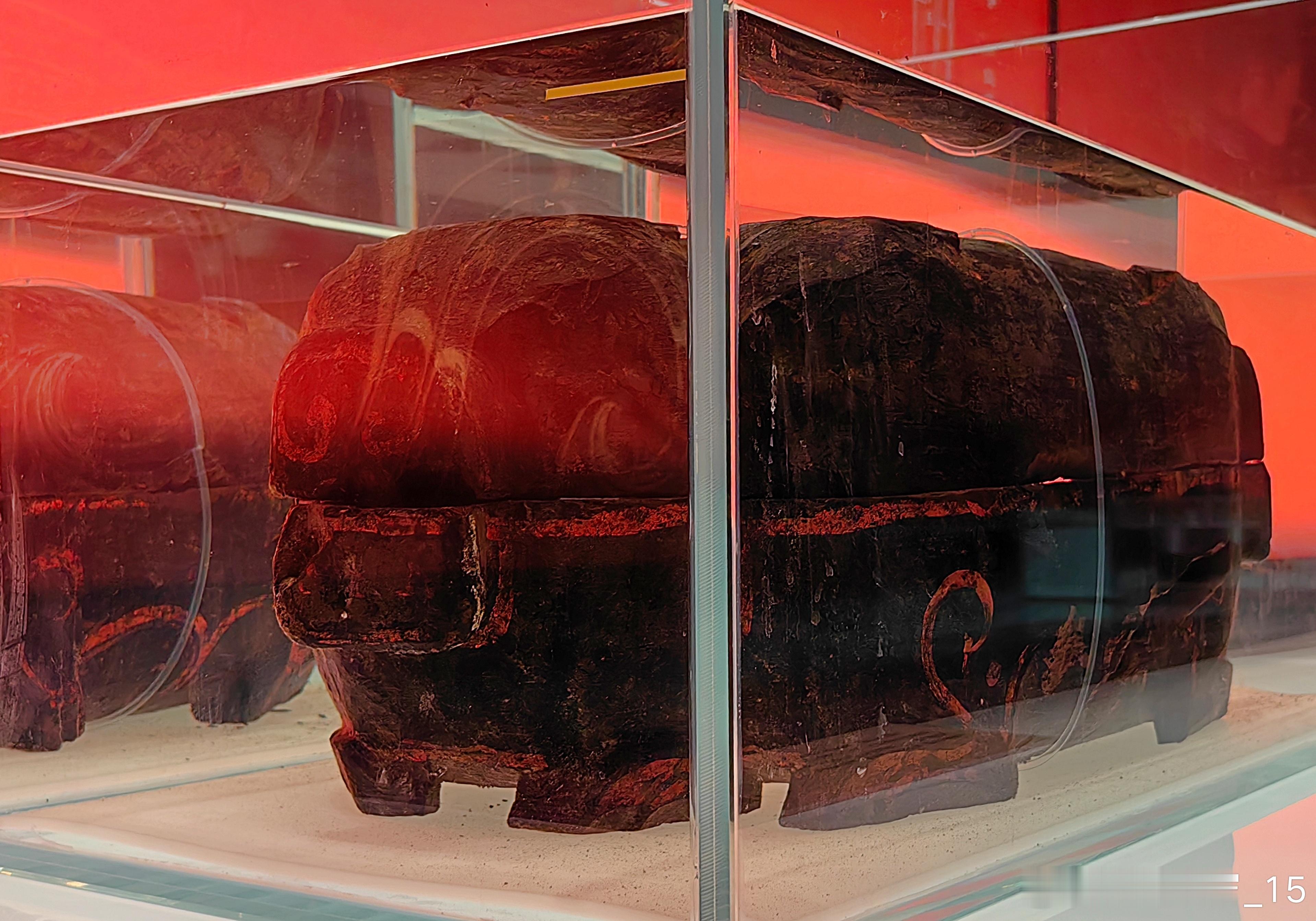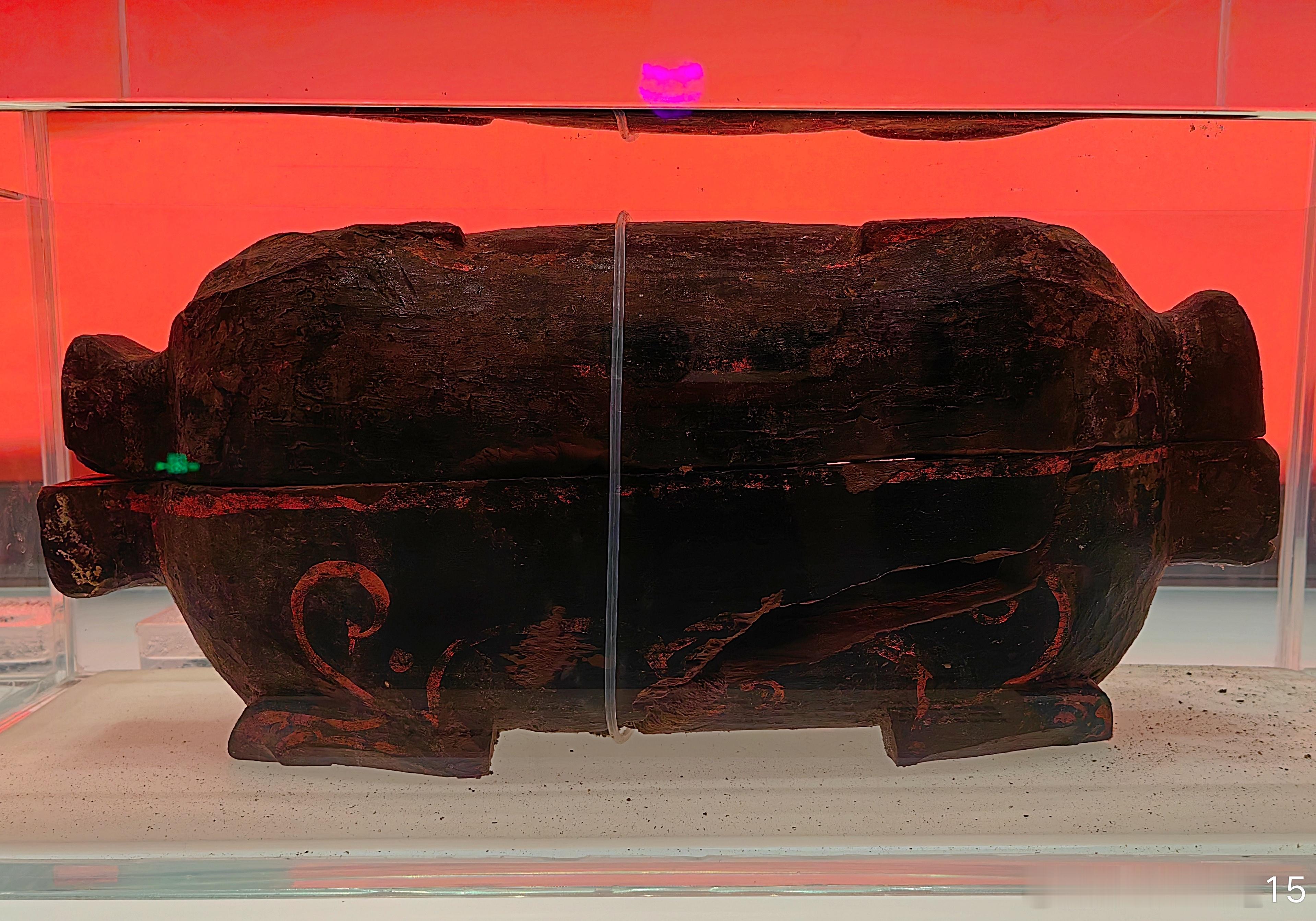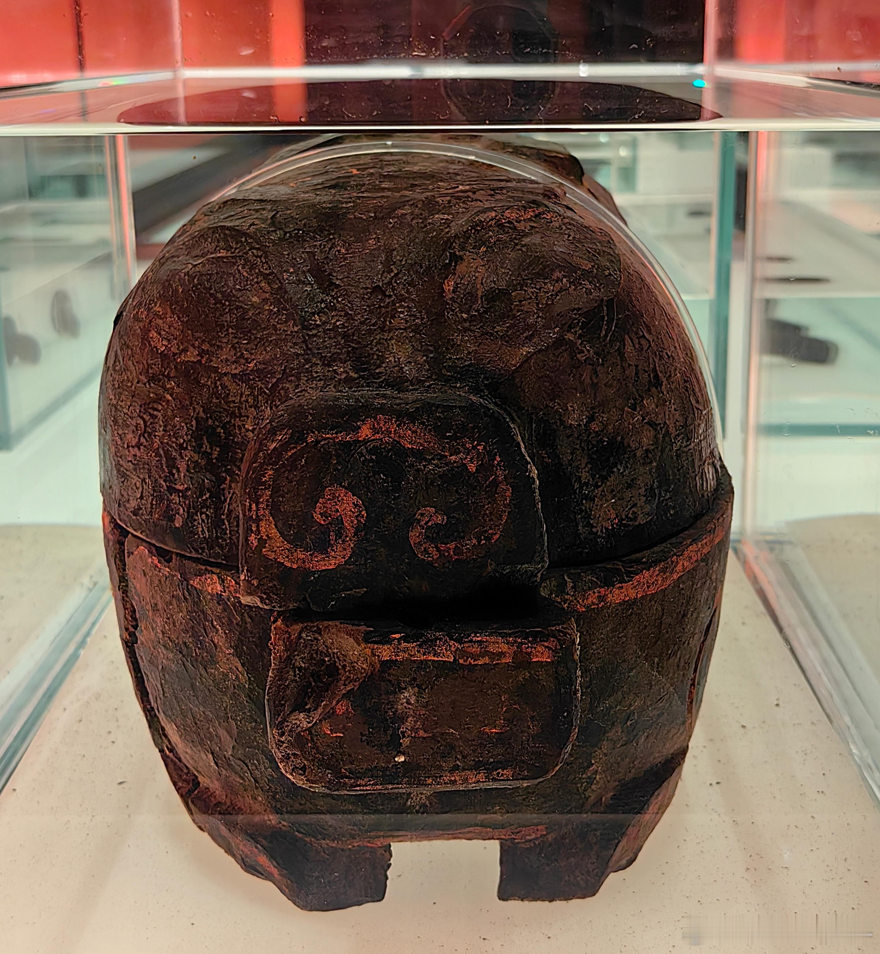 我的2026 【遇见考烈王-安徽淮南武王墩一号墓考古成果展】彩绘猪形漆木盒·战国安徽淮南武王墩一号墓出土。盒两端各雕成一猪头状,四足伏地,盖与器身通过榫卯扣合。此类漆盒常见于高等级楚墓,是楚国漆器的典型器型。2026.1.21国家博物馆约会博物馆文物