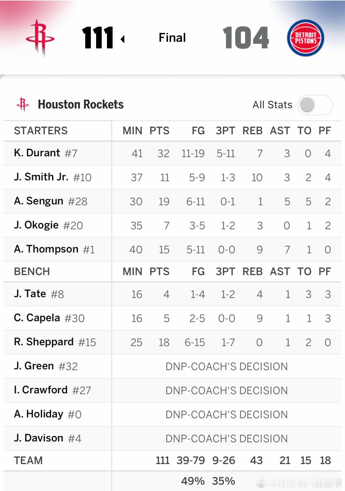 全场比赛结束,火箭客场背靠背111比104客场战胜东部第一的活塞!!!真不容易🔥杜兰特登场41分钟!!!19中11拿下32分7篮板3助攻!!!!我火箭真喜欢啃老啊!!只要阿杜一下去,火箭必定就是输分的,37岁的老将经不住这样造的!火箭vs活塞火箭战胜活塞休斯顿火箭休斯顿火箭