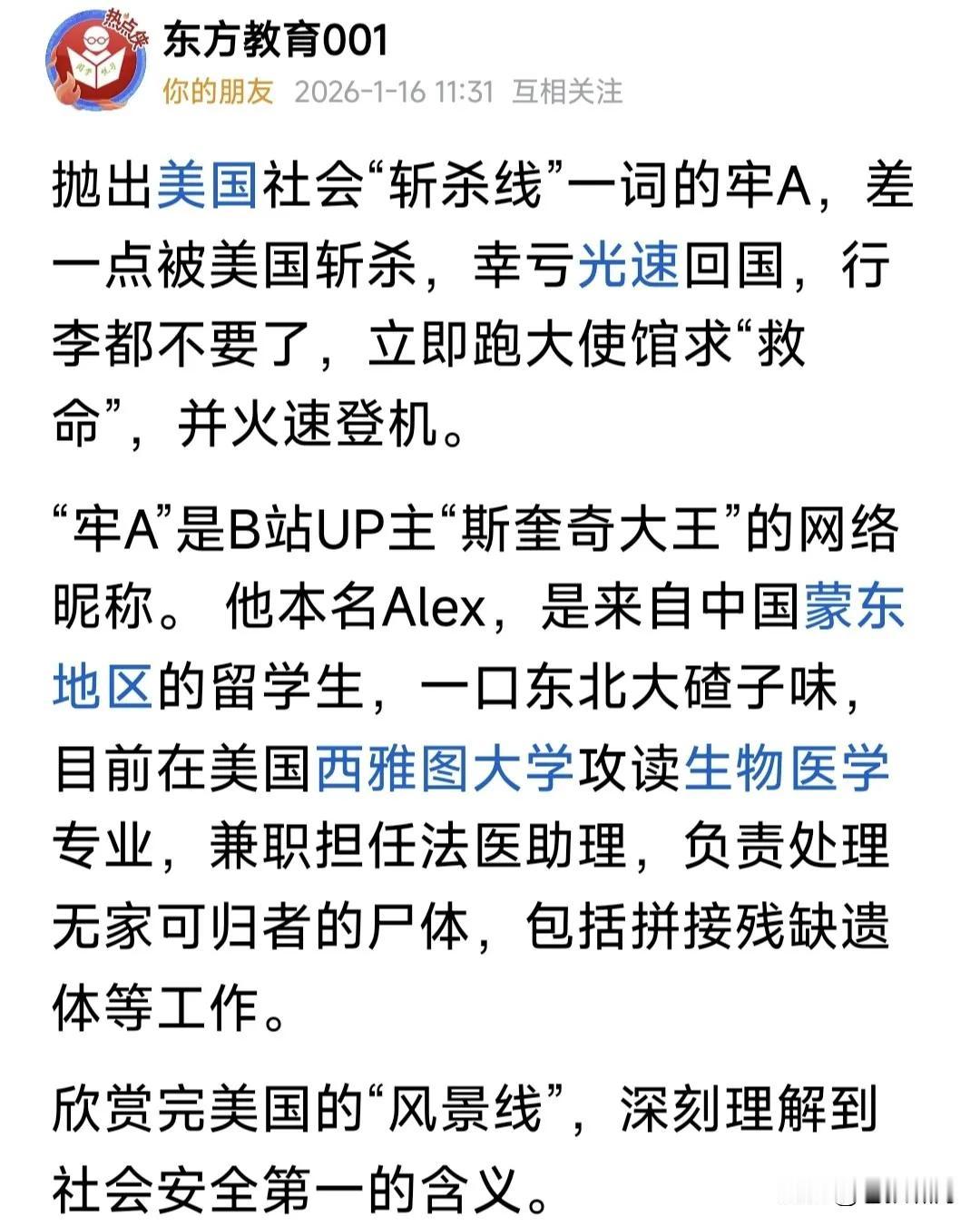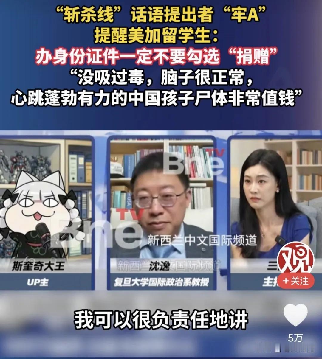 【牢A又立新功】 张维为与沈逸的遥遥领先,最初在小红书中美网友对比中得到验证让张维为又火了一把。 这次牢A横空出世,发明“斩杀线”被广泛运用,又一次震撼舆论阵地,张沈联手从简入深揭露美国斩杀线的残酷与悲哀。 把美国要拿身份证必须“捐赠”的阴谋诡计一一揭穿,但有网友调侃移植器官,我们也是遥遥领先。 牢A现身说法给张沈做了完美背书,逃离美国人间炼狱的最好注脚。 有脑子人只要思考一下就知道如今张沈大行其道的风气,牢A的出现只不过一次升华主题教育。