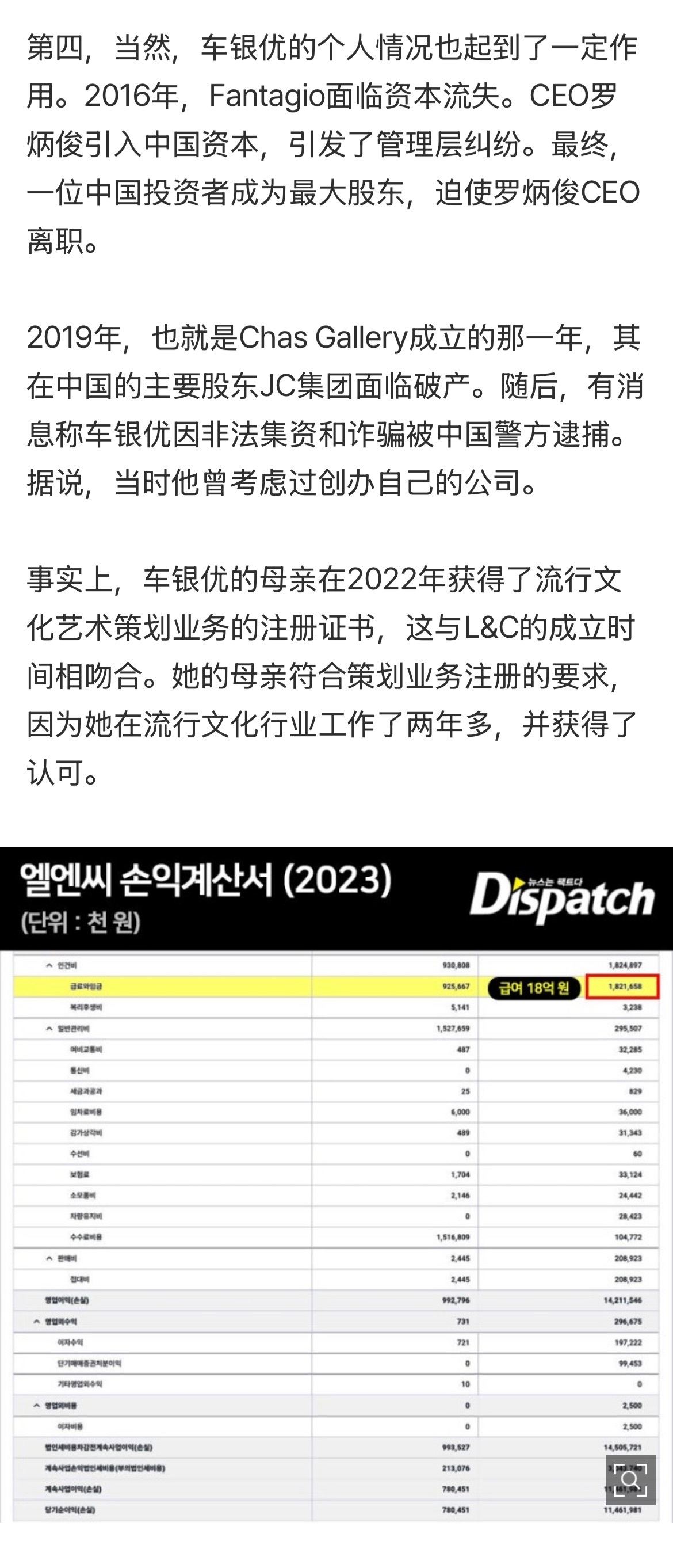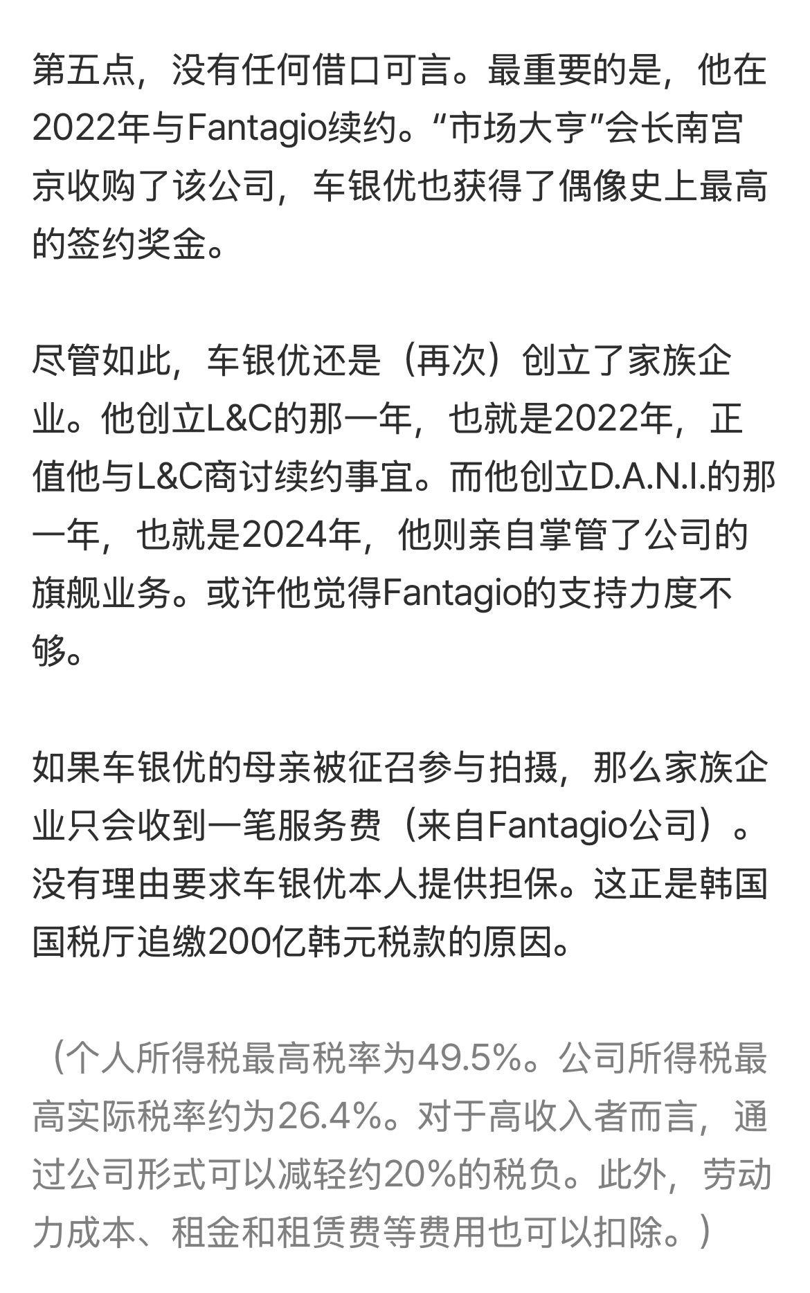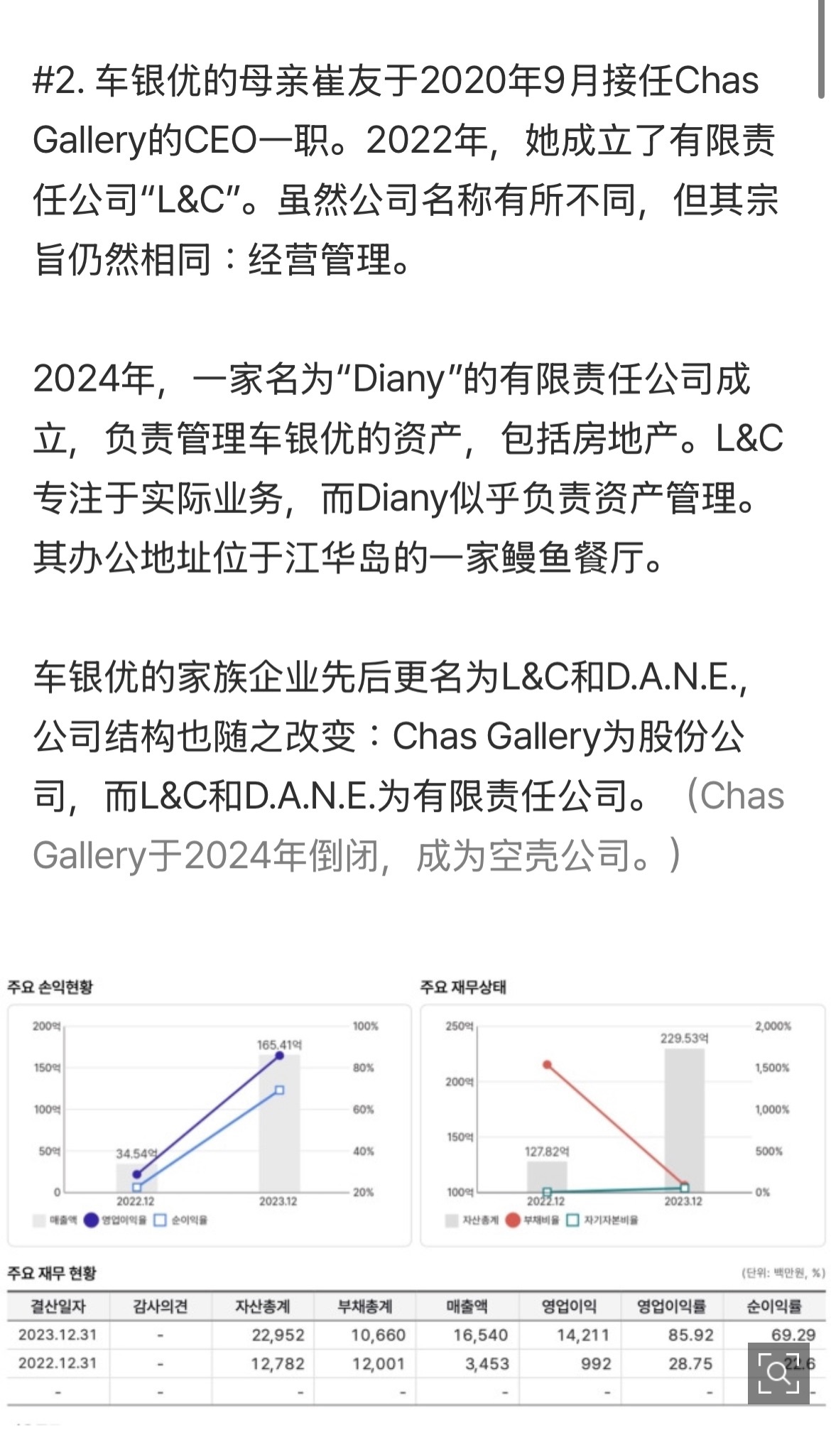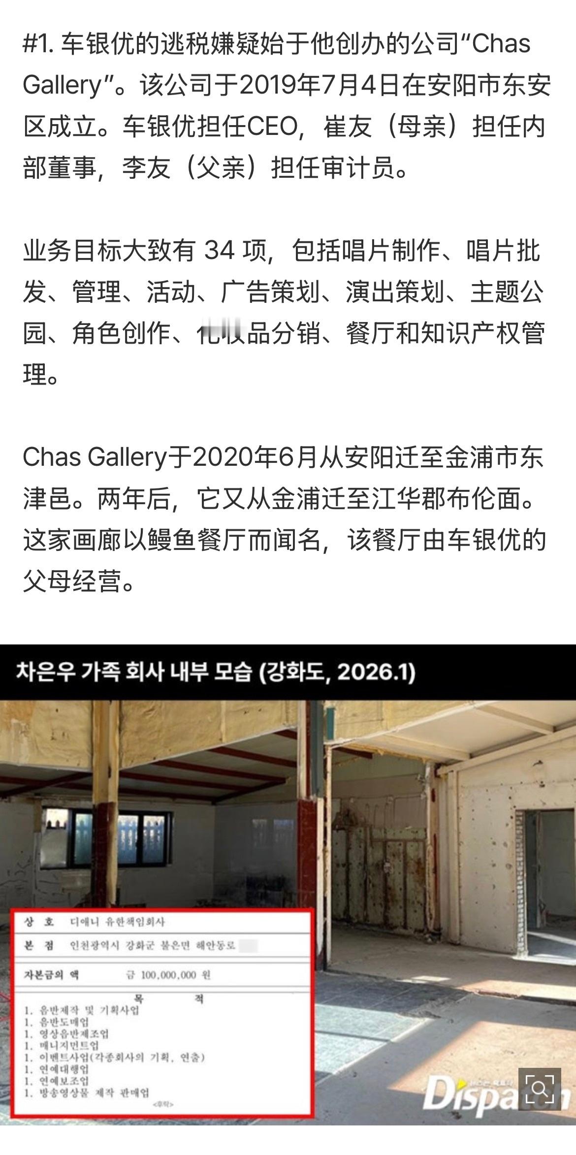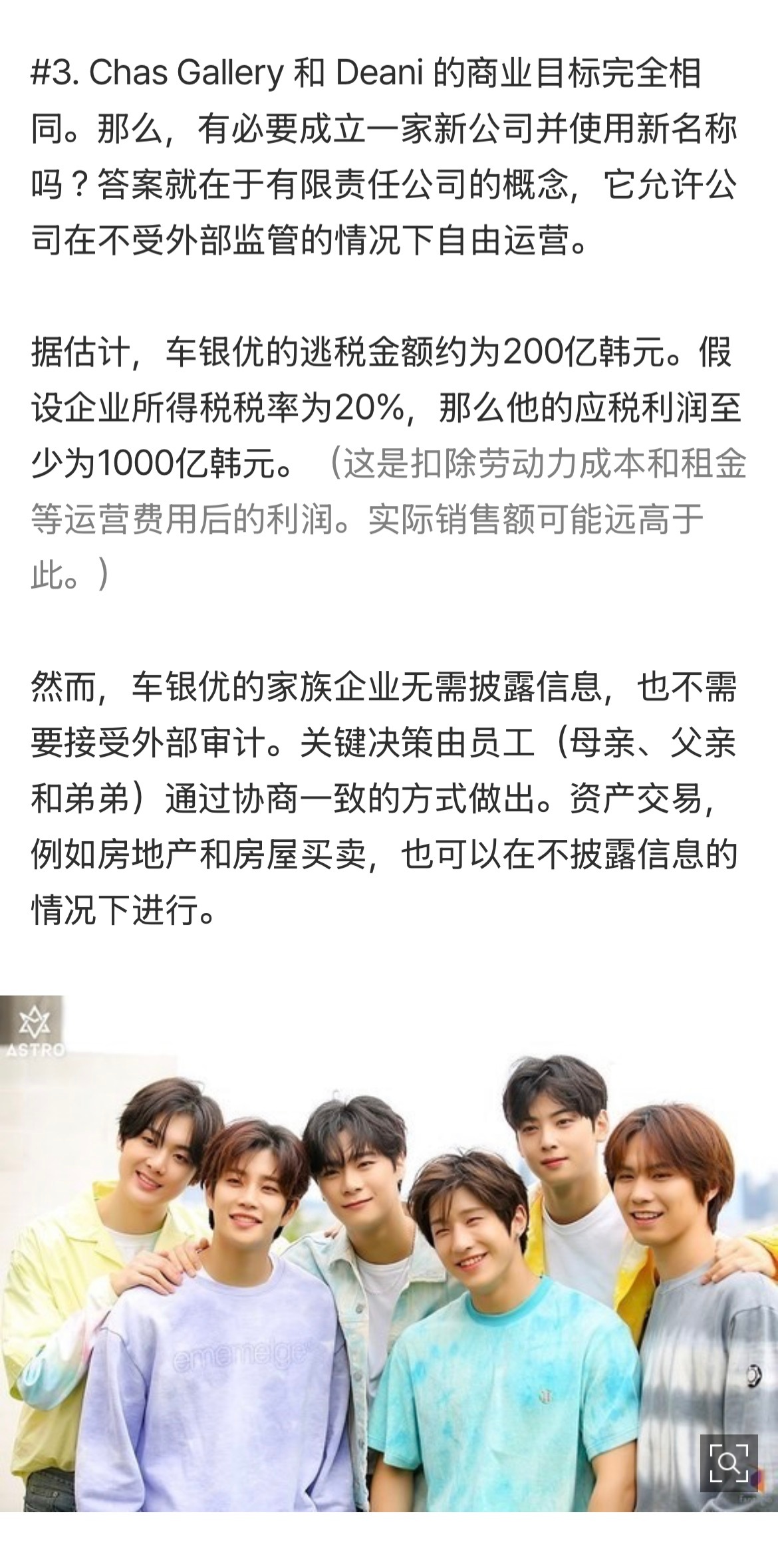 车银优至少赚了1000亿 D社调查车银优家族企业,称如果按照200亿逃税金额来算,应税利润至少是1000亿(约4.8亿人民币) 概括一下D社调查:1.车银优涉的空壳公司先后换过三次地址,从安阳到金浦到江华郡,最后就是现在所说的“鳗鱼店”,而19年开始注册公司所应经营的范围是唱片制作、唱片批发、管理活动、广告策划等2.19年注册公司A(代称)CEO是车银优,20年换成了车银优的母亲,22年车银优母亲又注册了一个新公司B,目的也是经营管理。24年又注册了新公司C,,负责管理车银优的资产。3.公司A为股份公司,而公司B和C是有限责任公司。4.公司A于2024年倒闭,成为空壳公司。