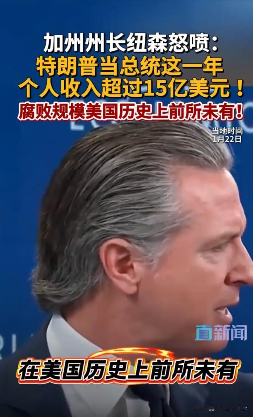 美加州州长纽森说特朗普一年贪腐超15亿美元 特朗普成了瑞士达沃斯论坛当仁不让的热门人物,他的言行不仅遭到西方社会的强烈谴责,同时也受到来自美国内的严厉抨击。 美加州州长纽森说,特朗普当总统这一年个人收入超过15亿美元,腐败规模在美国历史上前所未有。 1月22号,新华社消息,美国加州州长加文·纽森在达沃斯论坛上曝出特朗普在过去12个月里个人收入超过15亿美元,怒批特朗普的腐败和贪污规模是美国历史上前所未有的。 纽森对媒体说,特朗普的演讲“无聊”且“粗鲁”。 当时,纽森发言说,特朗普在12个月就收入15亿美元,这是如何办到的?这种大规模的贪污与腐败事件令人震惊。 我们怎么能够容忍这种事情,我们必须进行严厉的公开谴责,这在美国历史上是前所未有的,他就在我们眼皮底下发生了。 看来,纽森真是一条硬汉,敢于硬刚特朗普,这样的人在美国并不多。
