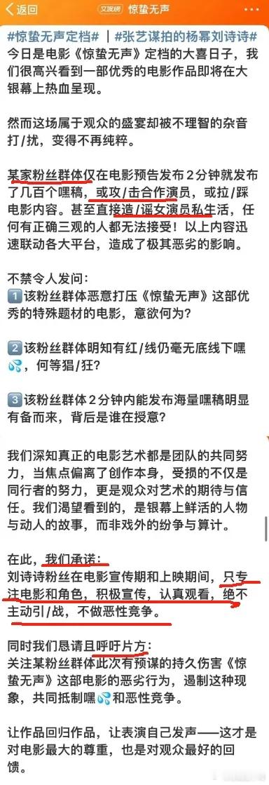 杨幂和刘诗诗的粉丝吵起来啦!这事是因为《惊蛰无声》发布了海报和预告片,就几秒的镜头,让两家粉丝闹起来了。两边都称片花刚发布没多久,就被对方买了上百个黑热搜,现在已经吵得公开化了。不过说实在的,她俩在这部张艺谋的电影里,主要也就是露个脸啦。能和张艺谋合作,这履历就已经很好看了。而且电影主要剧情估计还是在男演员那边,一分钟的预告,她俩每人就一秒镜头,真没必要为这点事大动干戈地吵架呀。