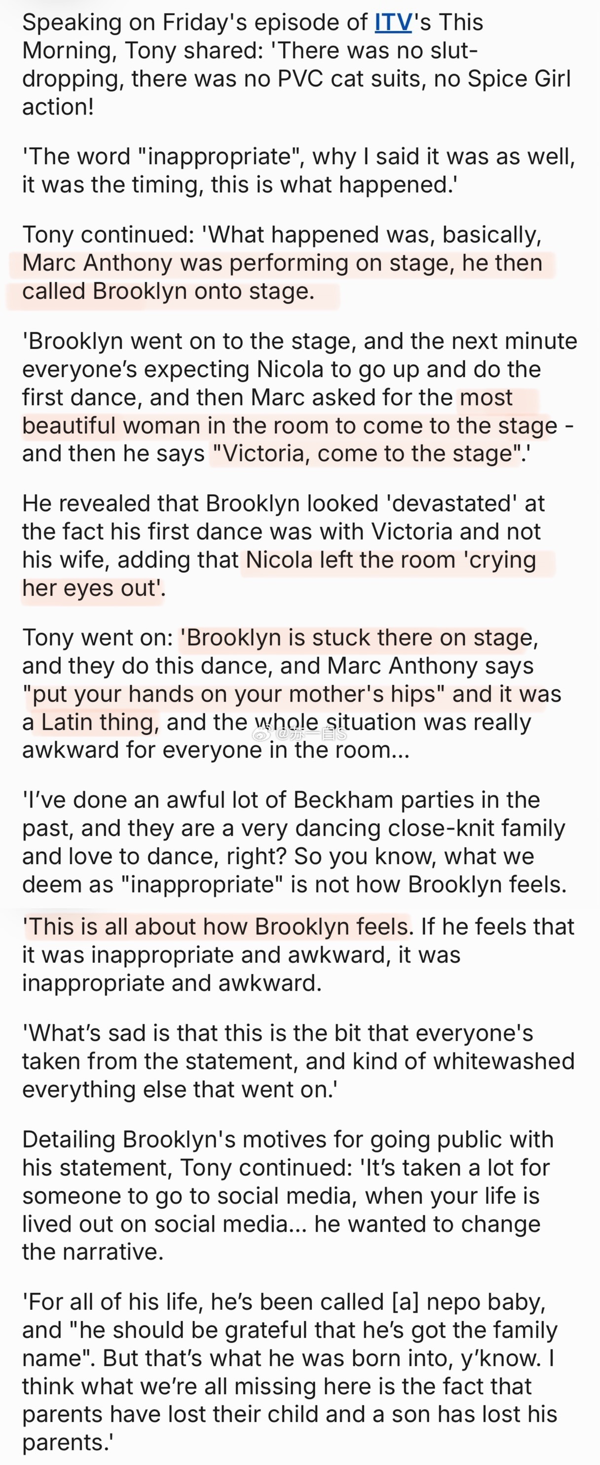 一位名叫Fat Tony的DJ(有说他正是布鲁克林婚礼的DJ,有说他只是现场嘉宾,反正他自认是大布的朋友且确定当天在婚礼现场)出来“还原”婚礼上那只被大布形容为“不恰当/不合适”的舞到底是怎样的……他表示,关键是“时机不合适”👇“基本情况是歌手Marc Anthony(JLo前夫)正在台上演唱,然后他把大布叫上了舞台。当所有人都以为接下来会是Nicola上台,跟新郎跳舞时,Marc却说:‘请全场最美的女人——维多利亚,上来吧。’”(这段跟之前爆料的一样👉网页链接)他说,“当大布意识到自己婚礼上的第一支舞的对象变成了母亲而不是妻子时,他看起来完全被击垮了,而Nicola则是哭到崩溃地离开现场。”(当然也有爆料说维多利亚跟大布跳的压根不是第一支舞🙉大布跟Nicola三个小时前就跳完第一支舞了……)“大布当时被困在台上,于是他跟维多利亚跳了那支舞。Marc Anthony还在一旁说,‘把手放在你母亲的腰上’,这是拉丁文化的一部分,但那一刻,整个房间都陷入了极度尴尬。”这位DJ表示,那是一支慢舞,不是什么桑巴舞,维多利亚的手臂确实环着儿子大布的脖子,但“没有任何低俗表演,没有PVC猫女装,没有Spice Girls式的舞台动作”。他觉得,整件事最核心的地方在于大布的感受,“如果他觉得那一刻不合适、很尴尬,那它就是不合适、就是很尴尬”。他还顺便帮忙解释为什么大布此次会公开发声,“要走到在社交媒体上发声这一步,对一个从小生活被放在聚光灯下的人来说,需要非常大的心理成本。他只是想改变叙事。他一辈子都被贴上‘星二代(nepo baby)’的标签,被说‘你应该感恩你拥有的这个姓氏’,但那是他出生就无法选择的。我觉得大家都忽略的一点是:‘父母失去了儿子,儿子也失去了父母”…… (纯粹是转述这个DJ的说法哈)