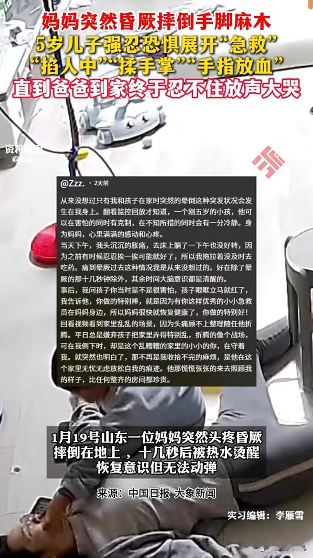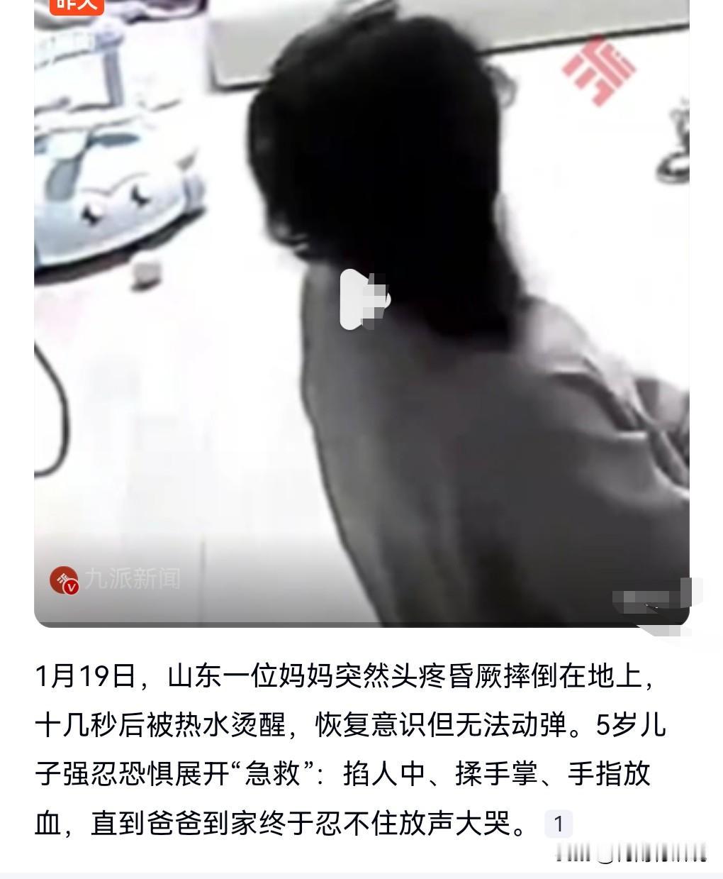 这宝宝真的是太聪明了。 近日,一妈妈突然晕倒,5岁儿子强忍恐惧施救。 这么小的孩子强忍心中的恐惧,一下掐妈妈的人中,一下揉妈妈的手掌。 直到爸爸回来,孩子才回归孩子的本性,害怕的哭了起来。 5岁的孩子能做到这个程度,已经相当可以的了。